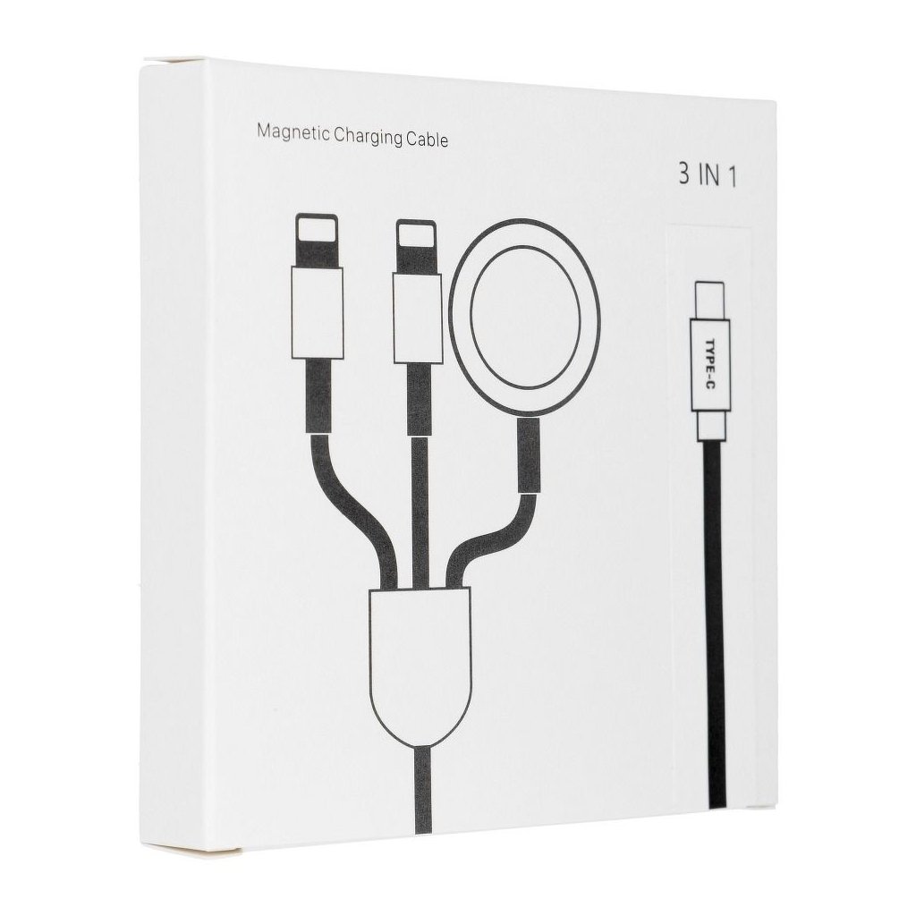 Nabíjací kábel 3v1 s dvoma konektormi Lightning pre iPhone a bezdrôtová nabíjačka pre hodinky Apple iWatch. Umožňuje efektívne napájať až 3 zariadenia Apple súčasne. Vhodné pre Apple iWatch, iPhone, iPad a tak ďalej.
