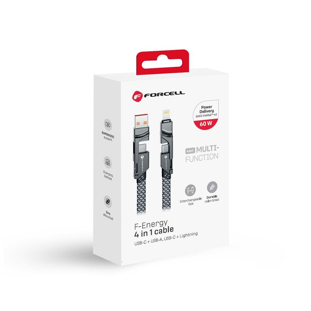 Nabíjací kábel kábel 4v1 FORCELL F-ENERGY USB-C / USB-A na USB-C / Lightning QC PD 3A 60W 1m chróm C241