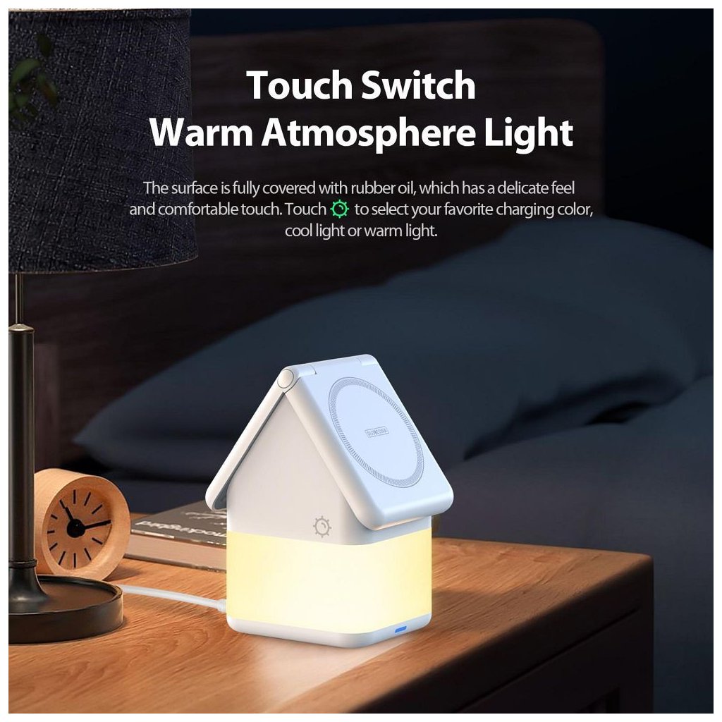 Bezdrôtová nabíjačka DUZZONA W20 4 v 1 s funkciou nočného svetla. Umožňuje indukčné nabíjanie telefónu, inteligentných hodiniek a slúchadiel. Podporuje nabíjanie pomocou MagSafe pre iPhone radu 12 a novšie. Určená pre zariadenia s výkonom do 15 W.