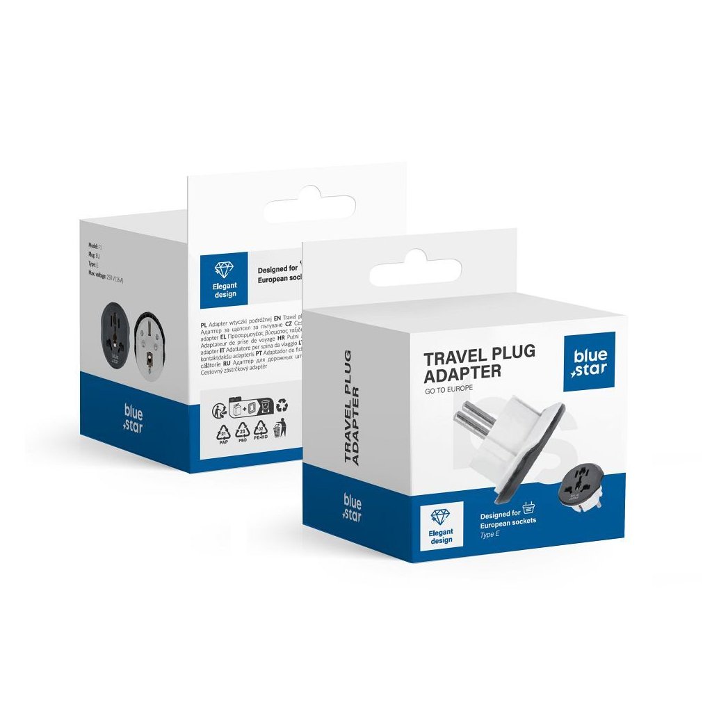 Cestovný adaptér BLUE STAR GO TO Europe (typ E) je nenahraditeľným príslušenstvom pre ľudí cestujúcich po Európe. Ide o praktický a ľahko použiteľný adaptér, ktorý umožňuje pripojiť zariadenia so zástrčkami z iných krajín do zásuviek typu E, ktoré sa bežne používajú v 34 krajinách.