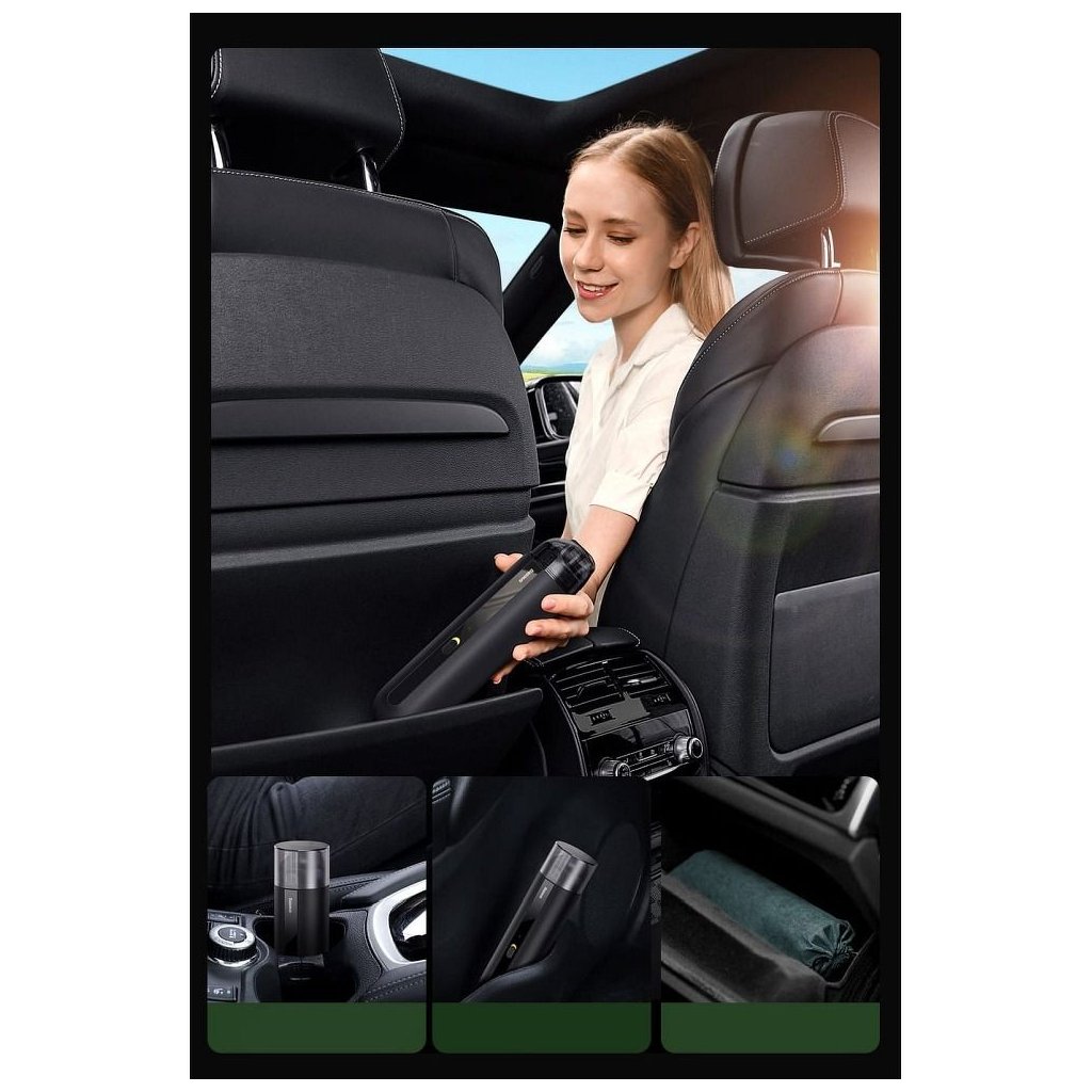 Kompaktná veľkosť vysávača, ktorá je o niečo väčšia ako termoska, umožňuje pohodlné skladovanie a nabíjanie v držiaku na poháre alebo v priehradke na rukavice. Priložený USB-C kábel umožňuje nabíjanie cez bežnú autonabíjačku. Sada obsahuje aj úložný kryt.