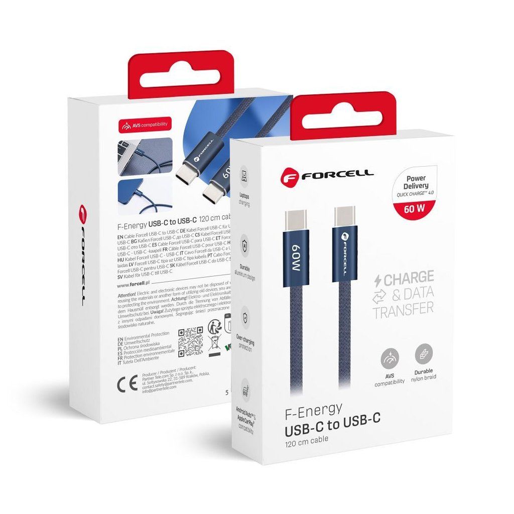 Kábel USB-C na USB-C Forcell F-Energy QC4.0 PD 3A 60W, farba Cafule, dĺžka 1,2 m, ACYH23, tmavomodrý