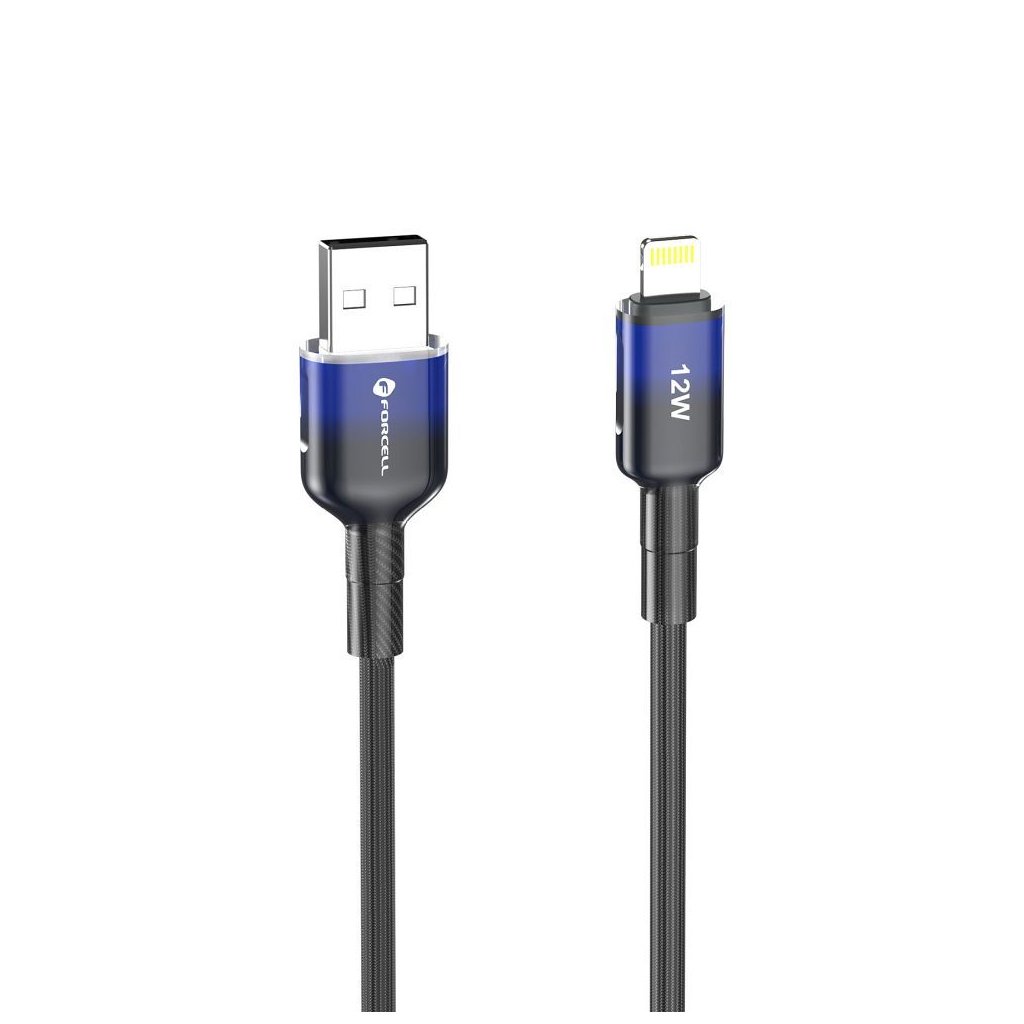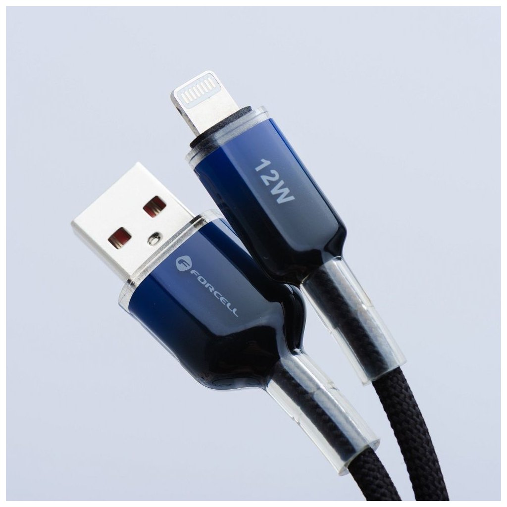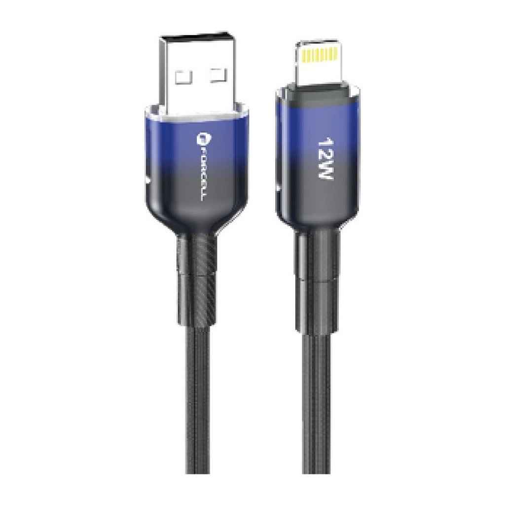 Univerzálny kábel USB-A na Lightning s výkonom 12 W, určený na bezpečné nabíjanie zariadení Apple. Kábel sa od štandardných modelov odlišuje jemne farebným konektorom.