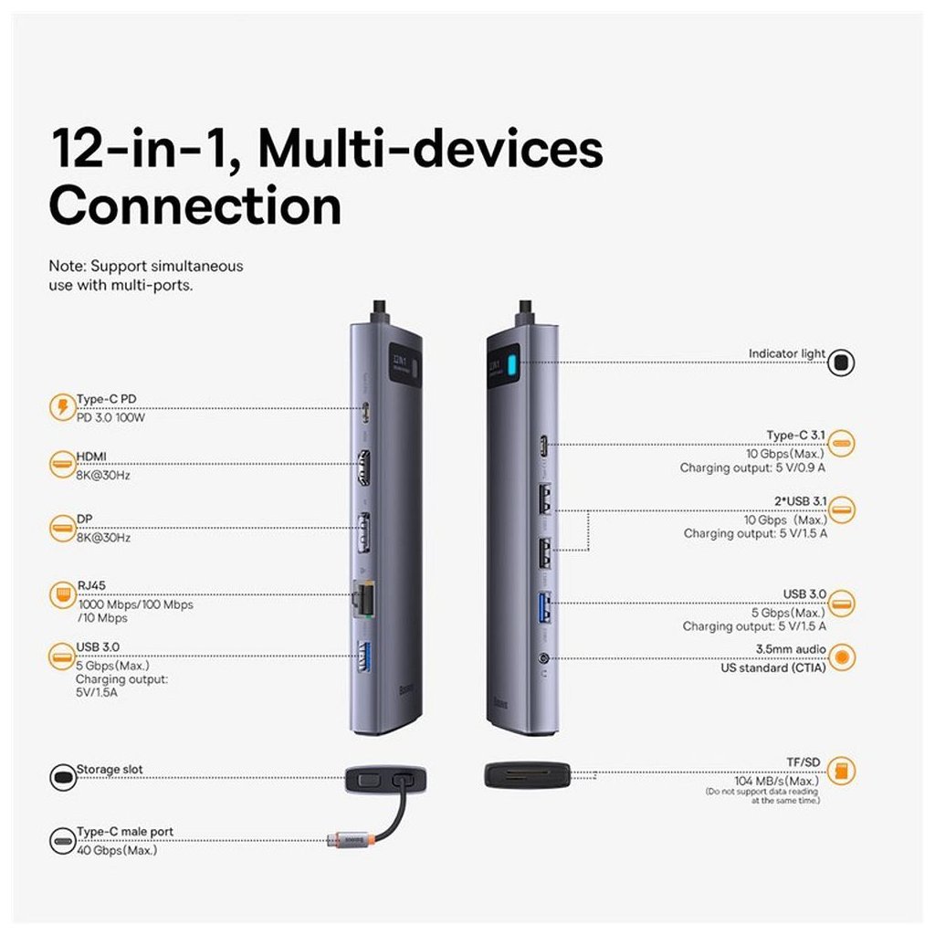 HUB vám umožňuje používať 12 portov: 2x USB-A 3.1, 2x USB-A 3.0, 1x USB-C 3.1, 1x USB-C PD 3.0 100 W, 1x HDMI 8K 30 Hz, 1xDP 8K 30 Hz, RJ45 Ethernet, 1x Mini Jack 3,5 a čítačky kariet SD a TF.