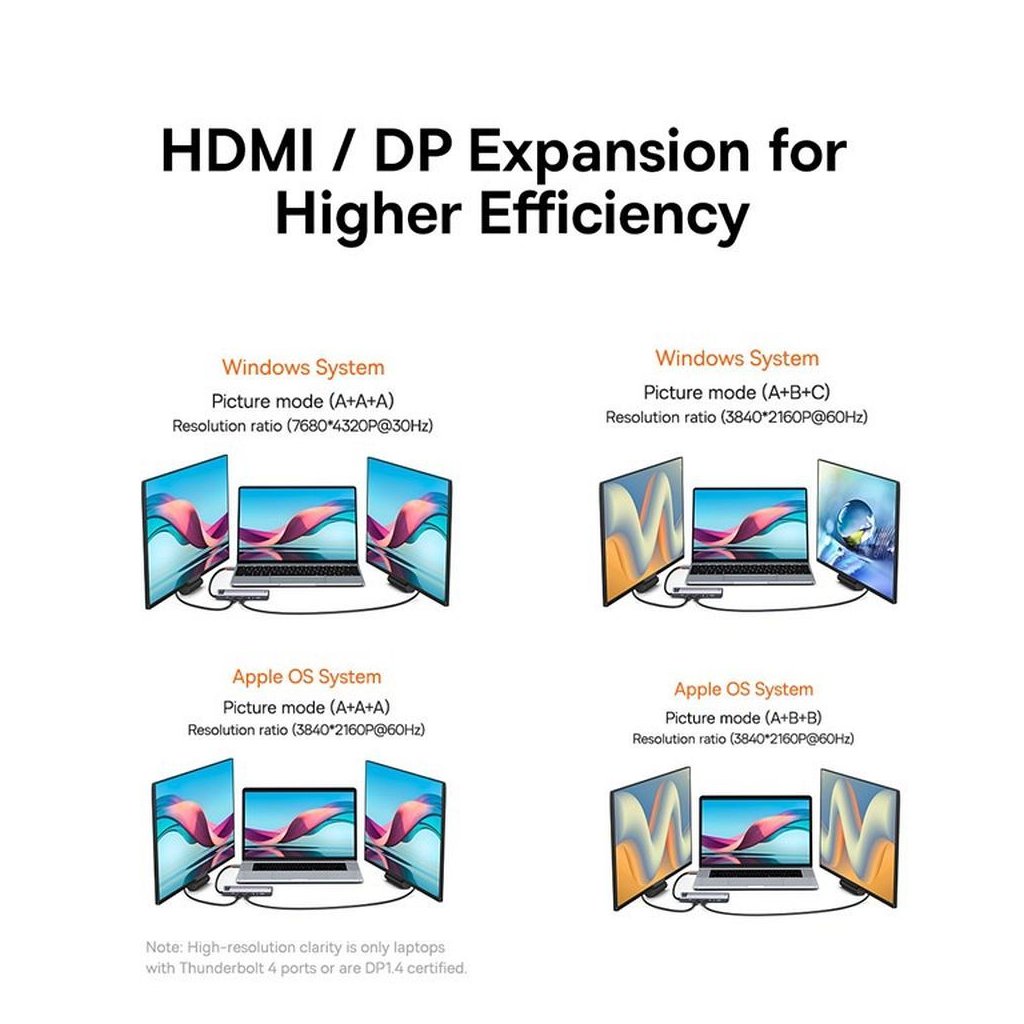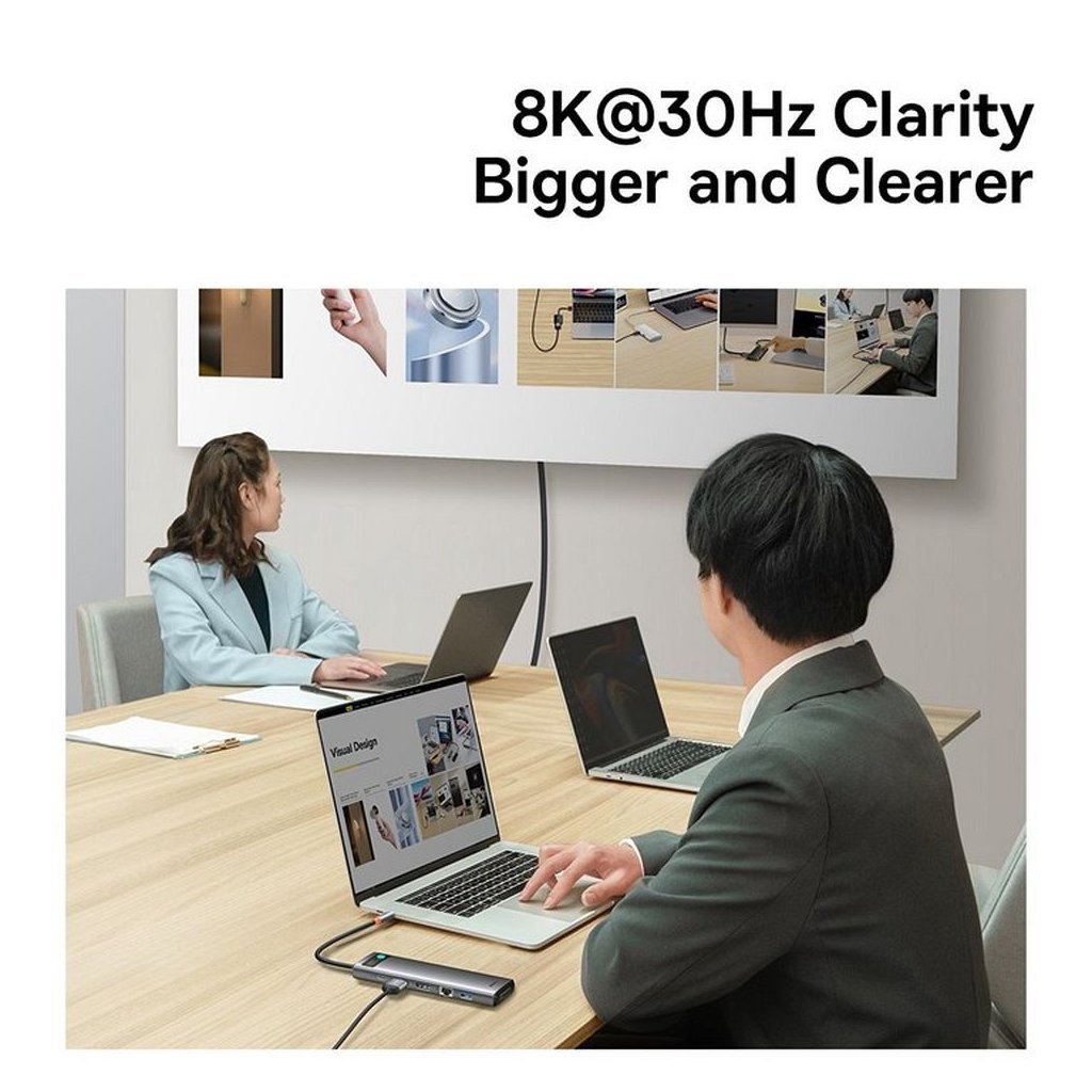 Hub má port HDMI a DispleyPort, vďaka ktorým môžete k svojmu zariadeniu pripojiť ďalšie monitory alebo projektor a sledovať filmy alebo zobrazovať prezentácie na väčšej obrazovke. Konektory HDMI a DP podporujú rozlíšenie obrazu až 8K 30 Hz.