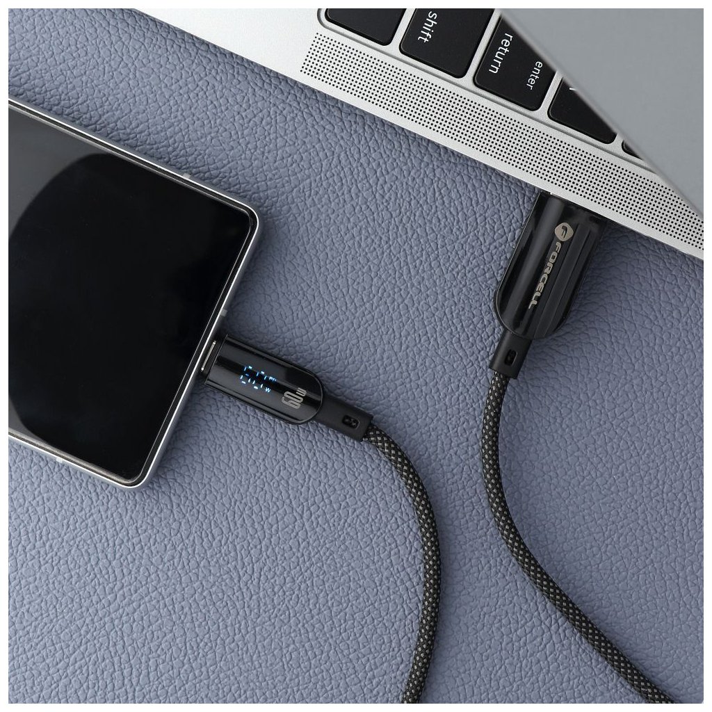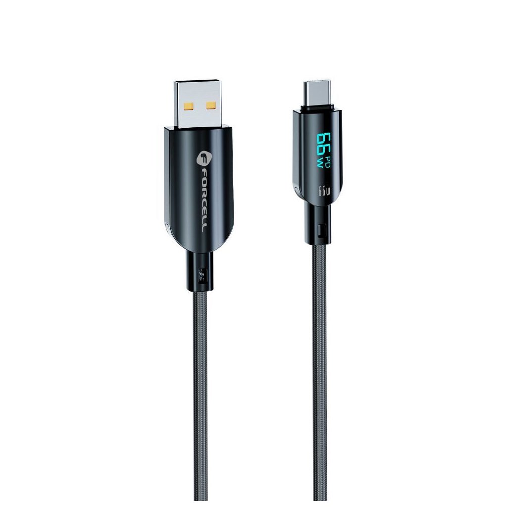 Univerzálny kábel USB-A na USB-C s vysokým výkonom 66 W, ktorý umožňuje rýchle a bezpečné nabíjanie smartfónov a tabletov. Vstavaný LCD displej informujúci o nabíjačke odlišuje tento kábel od štandardných modelov.