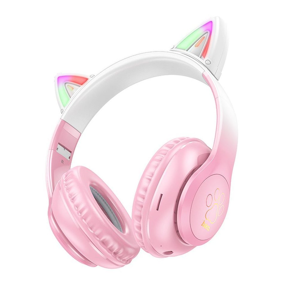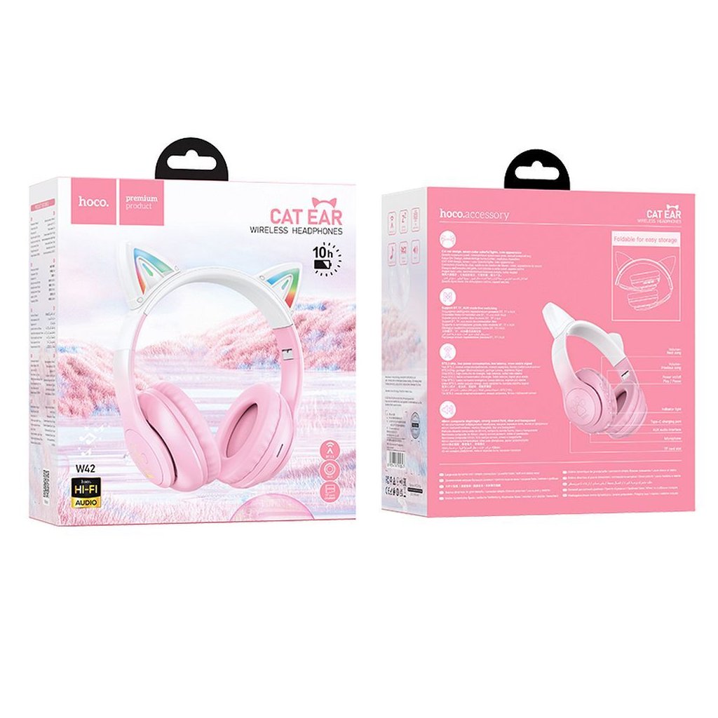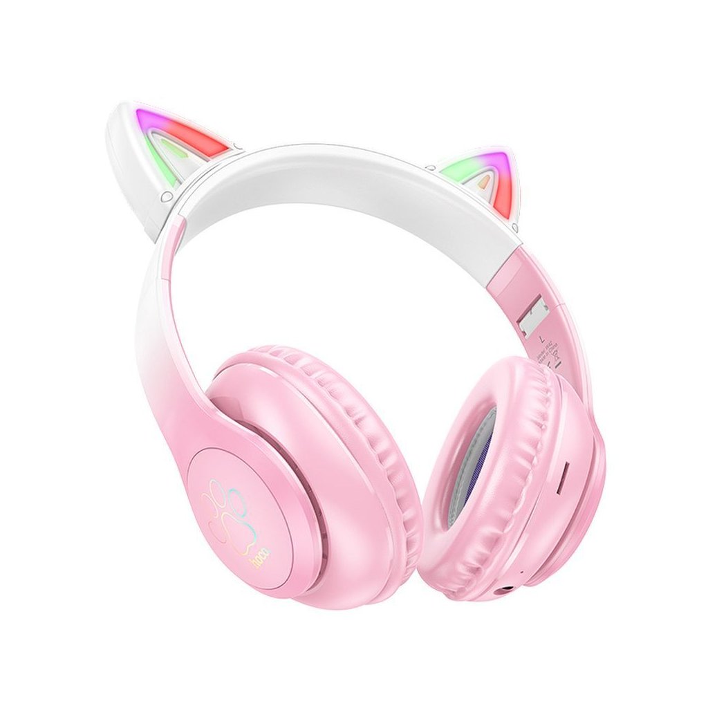 Bezdrôtové slúchadlá Hoco W42 s mačacími ušami. Umožňujú kvalitnú reprodukciu zvuku a efektívne vybavovanie hovorov. Ideálny darček pre deti. Vďaka veľkej kapacite batérie sú slúchadlá ideálnym doplnkom na dlhé cesty a umožňujú počúvať obľúbenú hudbu až niekoľko hodín. Slúchadlá podporujú Bluetooth, TF karty, AUX a ďalšie režimy. Pohodlné náušníky zvyšujú komfort a nezaťažujú uši. Nastaviteľná čelenka umožňuje prispôsobiť parametre výrobku tvaru hlavy používateľa. Vďaka svetelnému dizajnu v tvare mačacích uší je výrobok ideálnym darčekom pre dieťa.