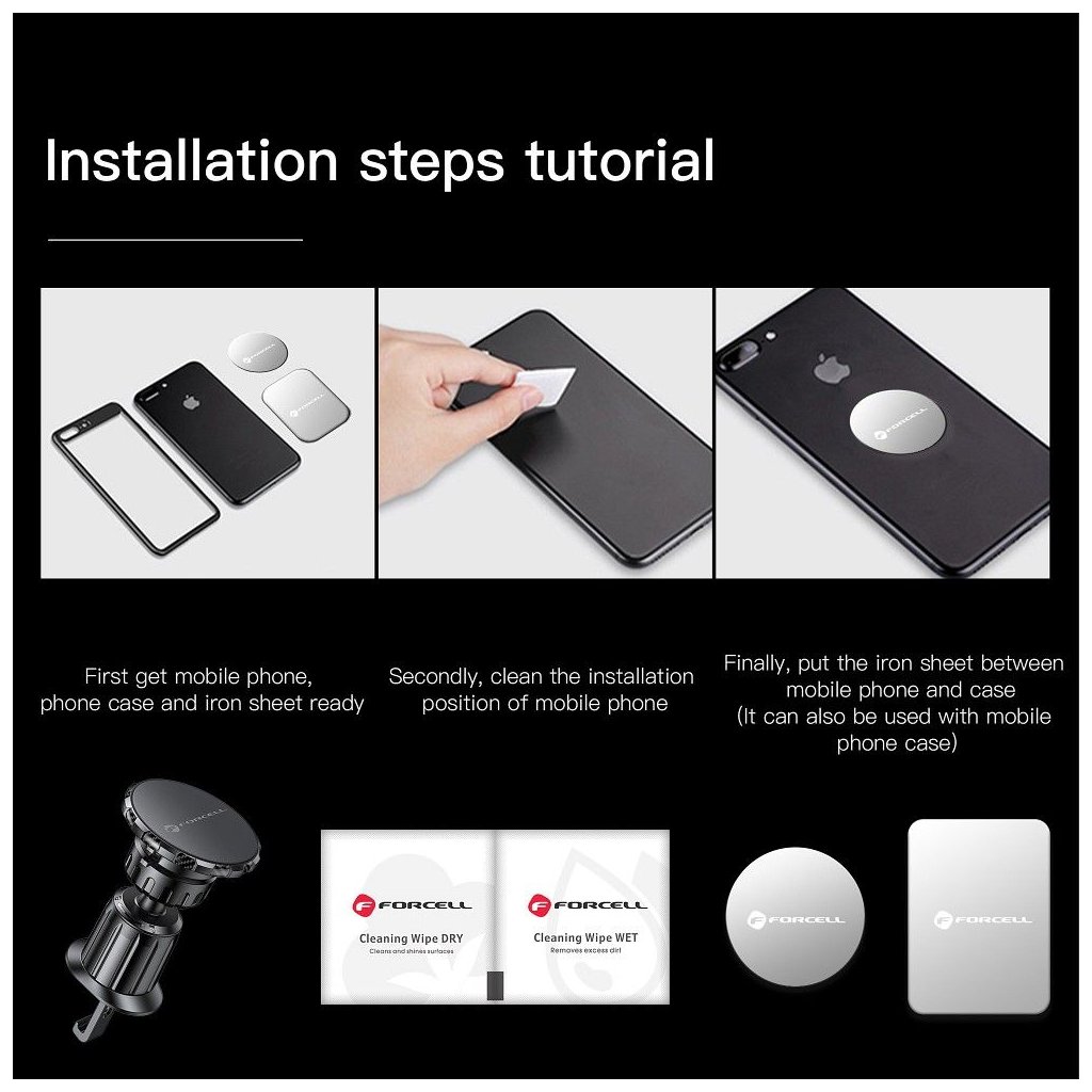 Montáž na vetracie otvory zaisťuje plnú viditeľnosť počas jazdy a klipový spôsob montáže zaručuje, že držiak bezpečne drží na povrchu. Súčasťou výrobku sú dve kovové doštičky, ktoré umožňujú magnetickú montáž telefónu.