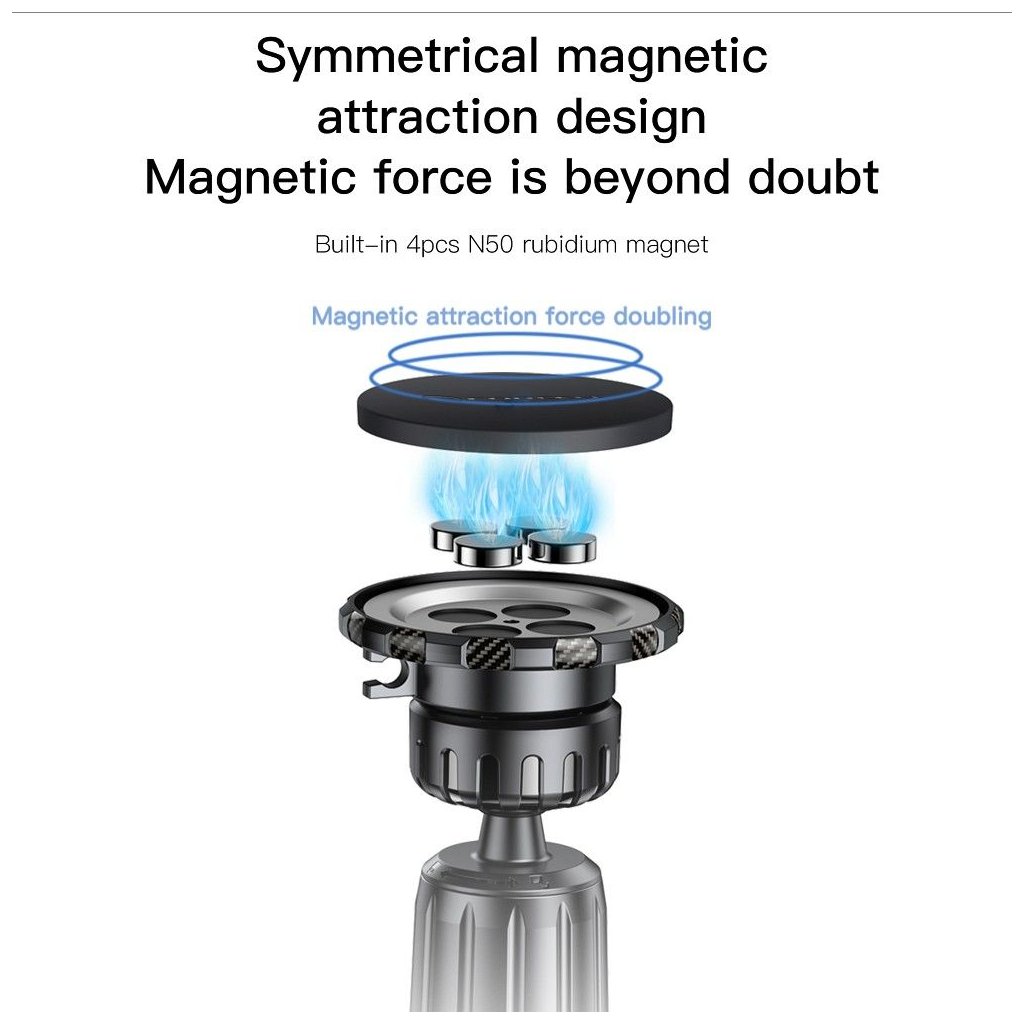 Magnetický držiak do auta určený na montáž do ventilačného otvoru. Vďaka otočnej hlavici a silným magnetom, ktoré zabezpečujú pevné uchytenie, umožňuje pohodlné a bezpečné používanie smartfónu počas jazdy.