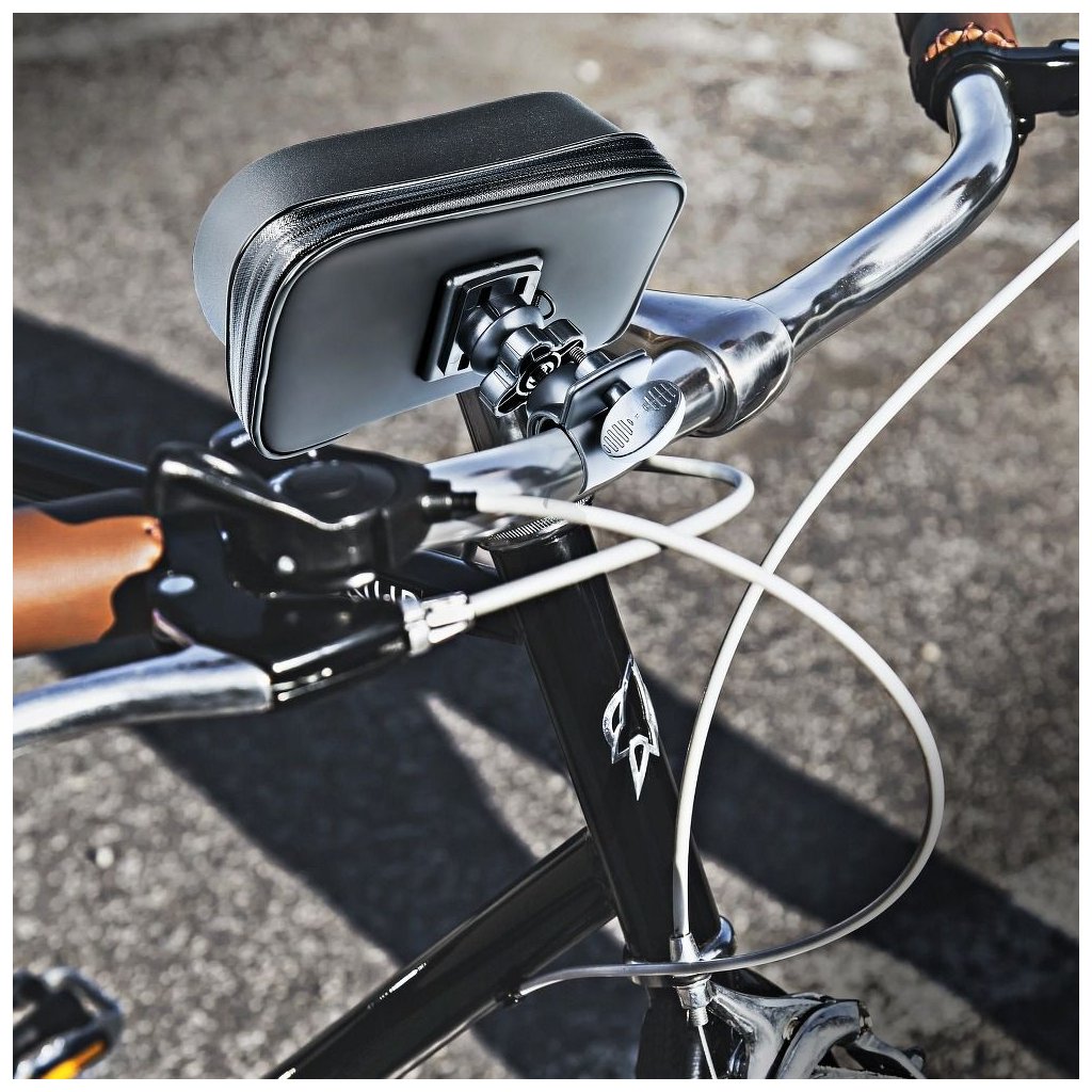 Vodotesný držiak na mobil na bicykel s priehradkou a zapínaním na zips. Zvyšuje bezpečnosť používania smartfónu počas jazdy na bicykli a upevňuje sa na rám bicykla. Nakoľko je vodotesný je ho možné využívať v náročných podmienkach a chráni zariadenie pred vlhkosťou a zaplavením.