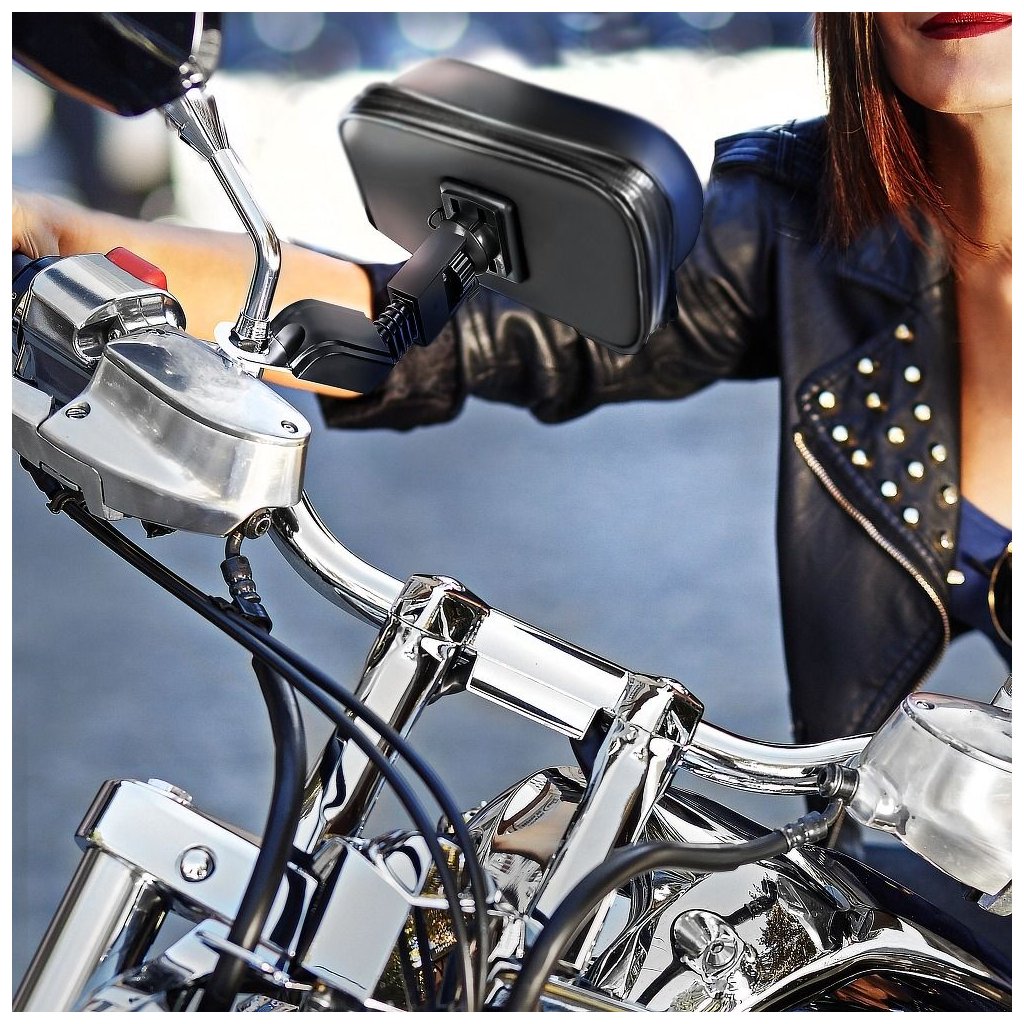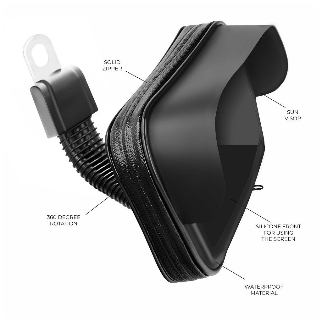 Držiak na mobil na motorku s prepážkou a zapínaním na zips. Zaisťuje bezpečnosť používania smartfónu pri jazde na motorke alebo skútri. Montovaný na rám motocykla. Produkt je kompatibilný s 5.5-6.3″ mobilnými zariadeniami.