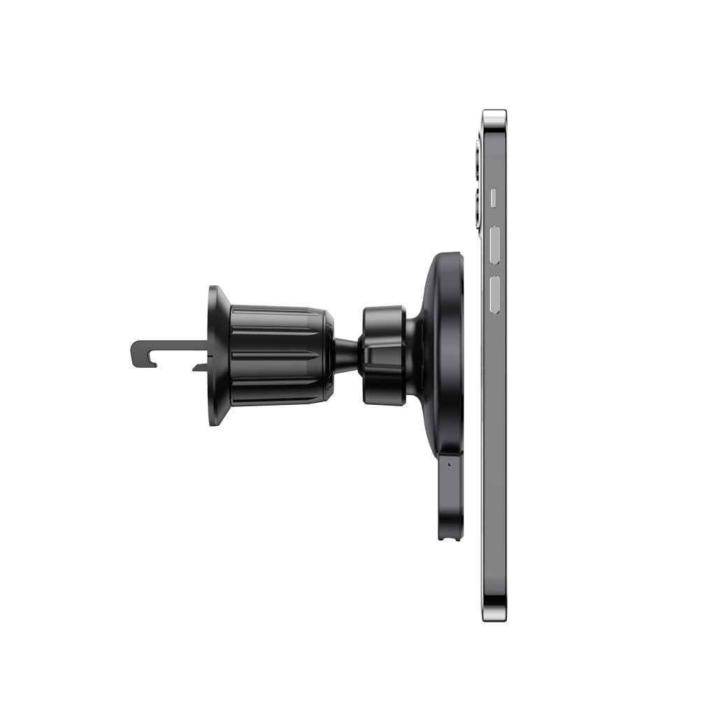 Magnetický držiak na mobil do auta s bezdrôtovým MagSafe nabíjaním. Vhodné na montáž do vetracej mriežky. Umožňuje vám bezpečne používať smartfón počas jazdy. Vyrobené z vysoko kvalitných komponentov zaručujúcu odolnosť proti poškodeniu a dlhodobé využívanie. Podporuje bezdrôtové nabíjanie MagSafe mobilných telefónov série iPhone 12 a vyššie, ktoré podporujú magnetické nabíjanie. Kompaktný a ľahký dizajn je vhodný do každého auta. Už viac nemusíte pripájať nabíjací kábel k telefónu. Jednoducho priložte telefón k magnetickému držiaku a silné magnety ho pritiahnu k sebe. Výkonná bezdrôtová nabíjačka okamžite začne nabíjať váš mobilný telefón s funkciou rýchleho nabíjania.