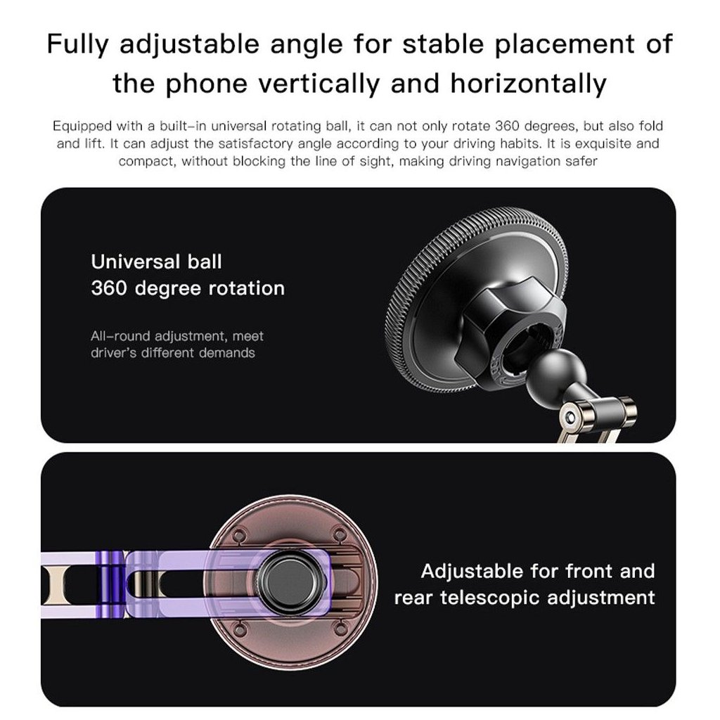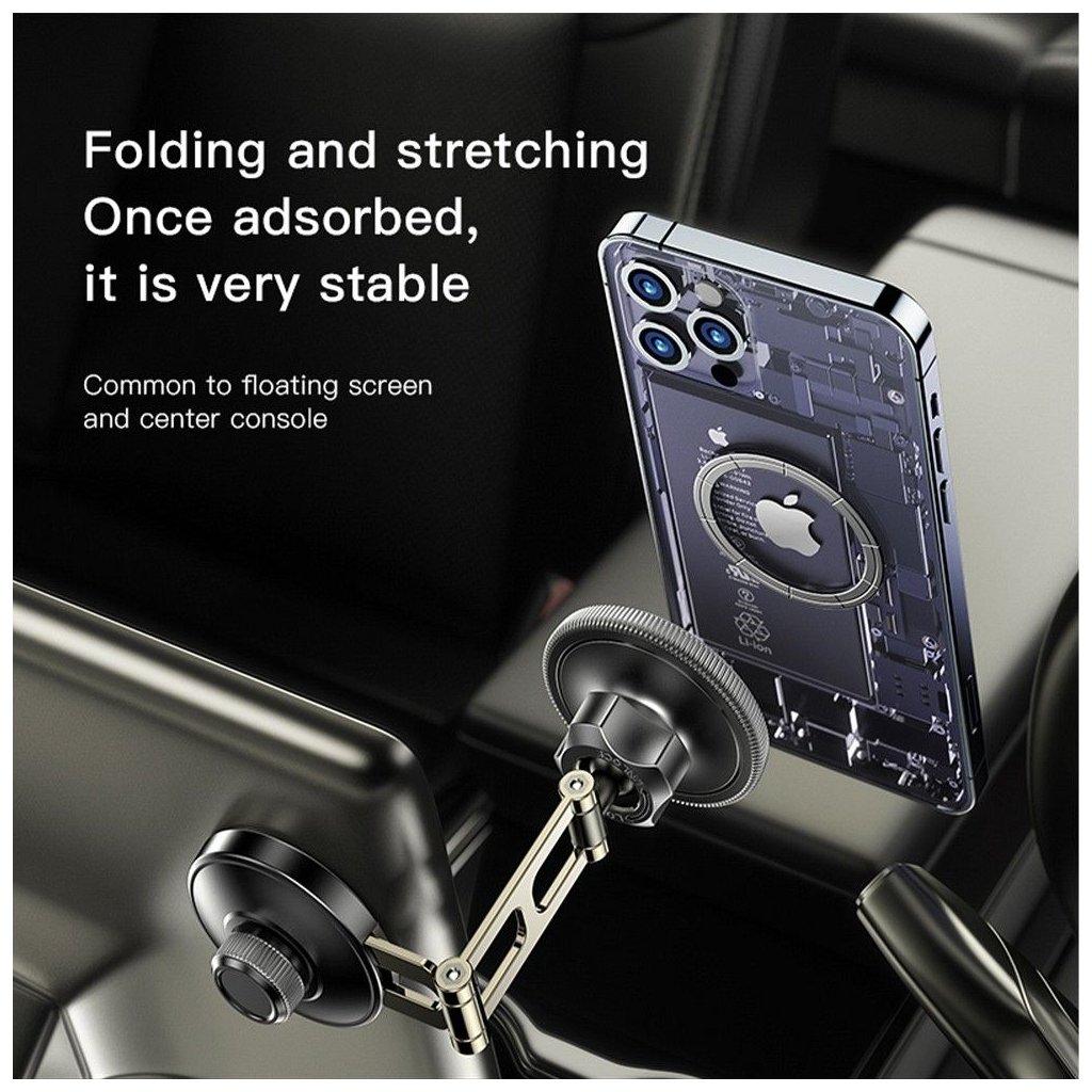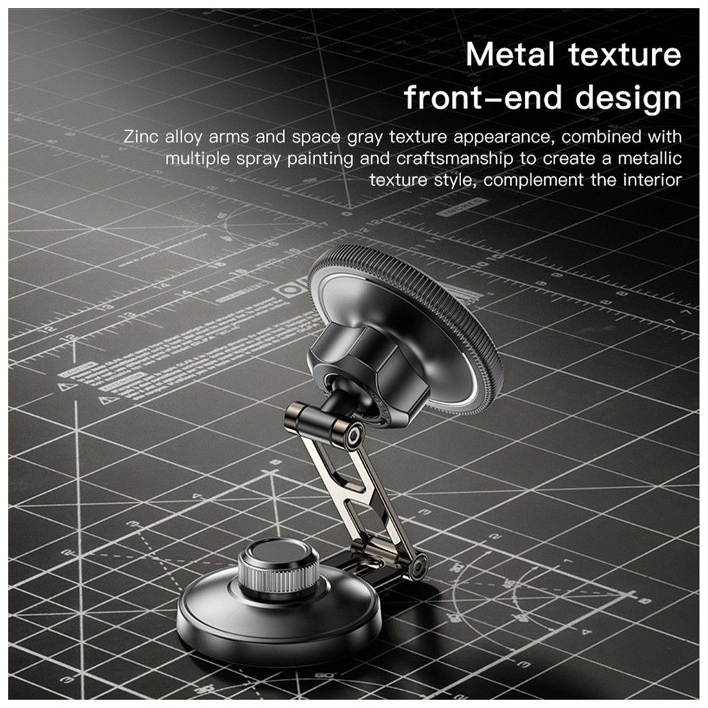 Magnetický držiak do auta je vyrobený z odolných materiálov, má skladacie kovové vyhotovenie a je voľne nastaviteľný. Možno ho pripevniť na čelné sklo, palubnú dosku alebo iný rovný povrch. Držiak je kompatibilný s technológiou MagSafe.