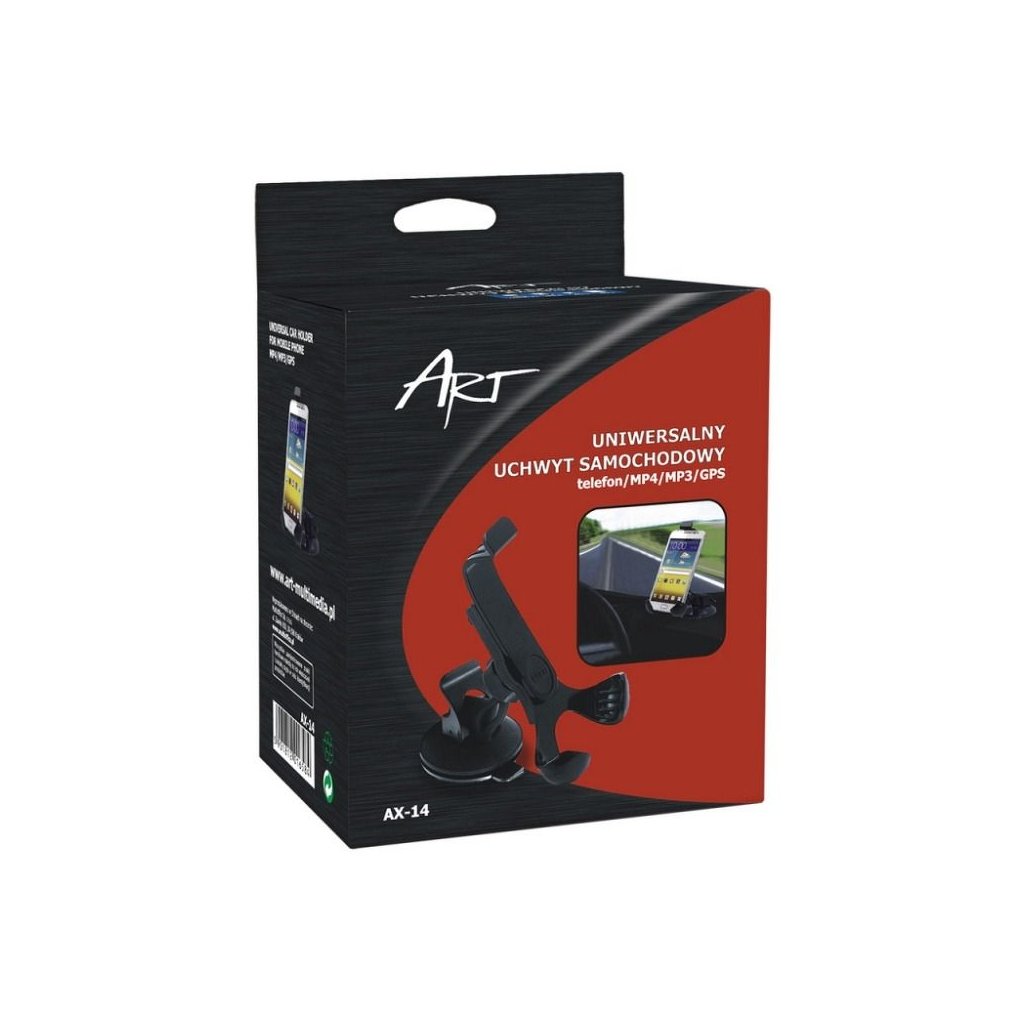 ART AX-14 je univerzálny držiak do auta určený na montáž na čelné sklo alebo palubnú dosku. Vďaka pevnej konštrukcii a Y-tvarovému upevneniu zaisťuje stabilitu a bezpečnosť zariadenia počas jazdy. Držiak je kompatibilný s telefónmi, MP4 prehrávačmi a GPS zariadeniami s uhlopriečkou obrazovky do 5,3".