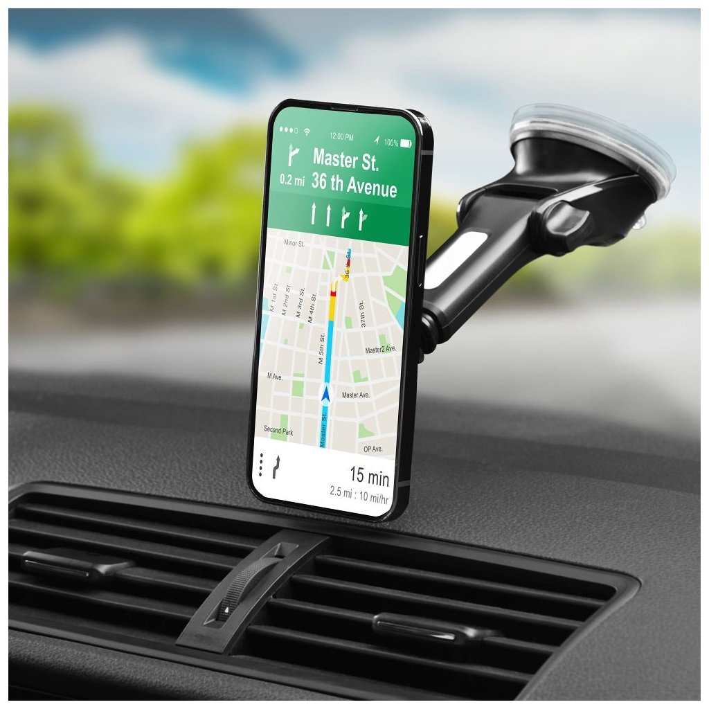 Magnetický držiak do auta s nastaviteľným ramenom. Umožňuje pohodlné a bezpečné používanie smartfónu počas jazdy. Upevňuje sa na čelné sklo alebo na palubnú dosku.