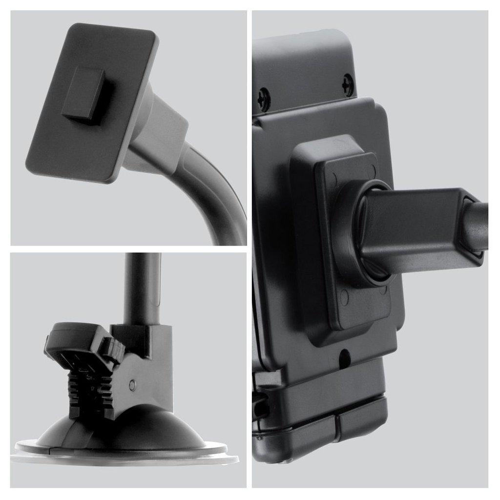 Držiak vyrobený z vysokokvalitného plastu poskytuje niekoľko možností montáže. Vďaka nastaviteľnému ramenu a prísavke vystuženej prídavnou svorkou ho možno umiestniť na čelné sklo alebo na hladký povrch palubnej dosky. Ak však chcete minimalizovať možné problémy s viditeľnosťou, a tým zvýšiť bezpečnosť, stačí rameno z držiaka odmontovať a následne ho umiestniť do vetracieho otvoru. V oboch prípadoch pevné upnutie zaručuje, že zariadenie zostane na mieste a nepoškodí sa ani na veľmi hrboľatých cestách.