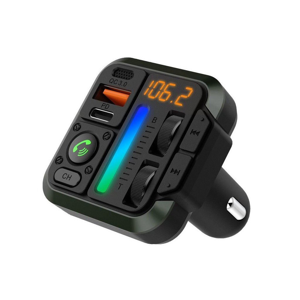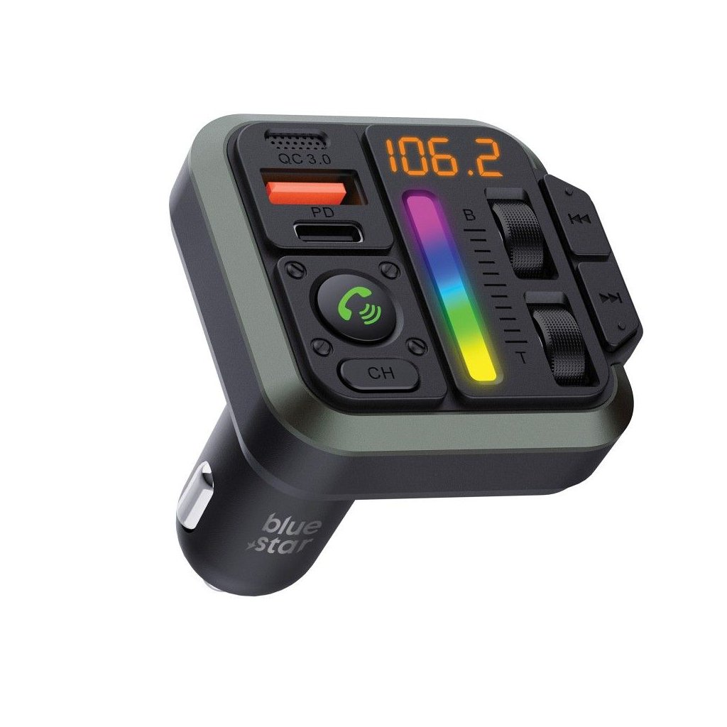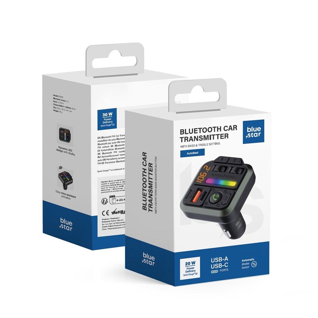 Vysielač FM do auta BLUE STAR AutoBeat MT04B s 2 portami - USB-A a USB-C - na rýchle nabíjanie a technológiou Bluetooth. Vďaka FM vysielaču môžete počas jazdy počúvať hudbu zo smartfónu a zabudovaný mikrofón vám umožní hlasno telefonovať.