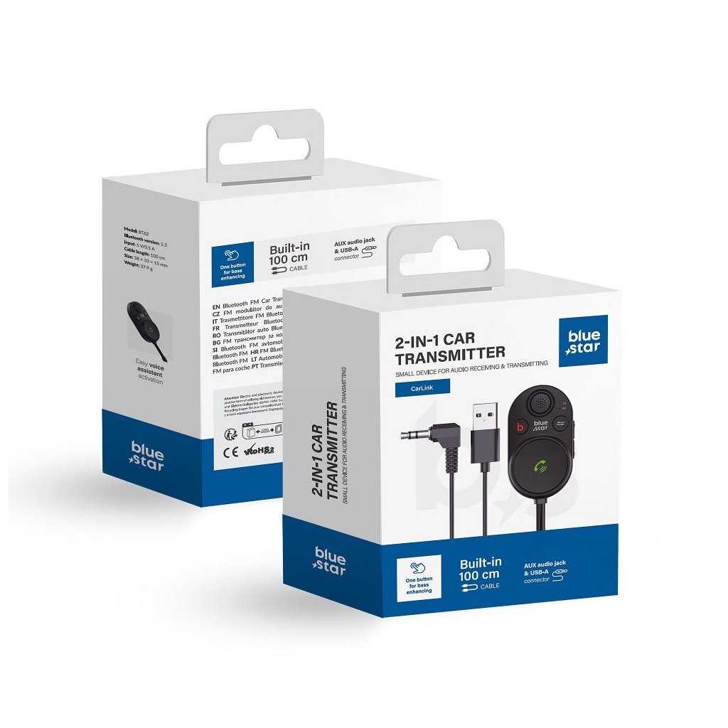 Vysielač FM 2v1 BLUE STAR CarLink BT62 je kompaktné zariadenie, ktoré umožňuje bezdrôtový prenos telefónnych hovorov a hudby prostredníctvom rozhrania Bluetooth a zároveň umožňuje streamovanie zvuku do stereosystému vozidla prostredníctvom aux kábla (v režime príjmu).