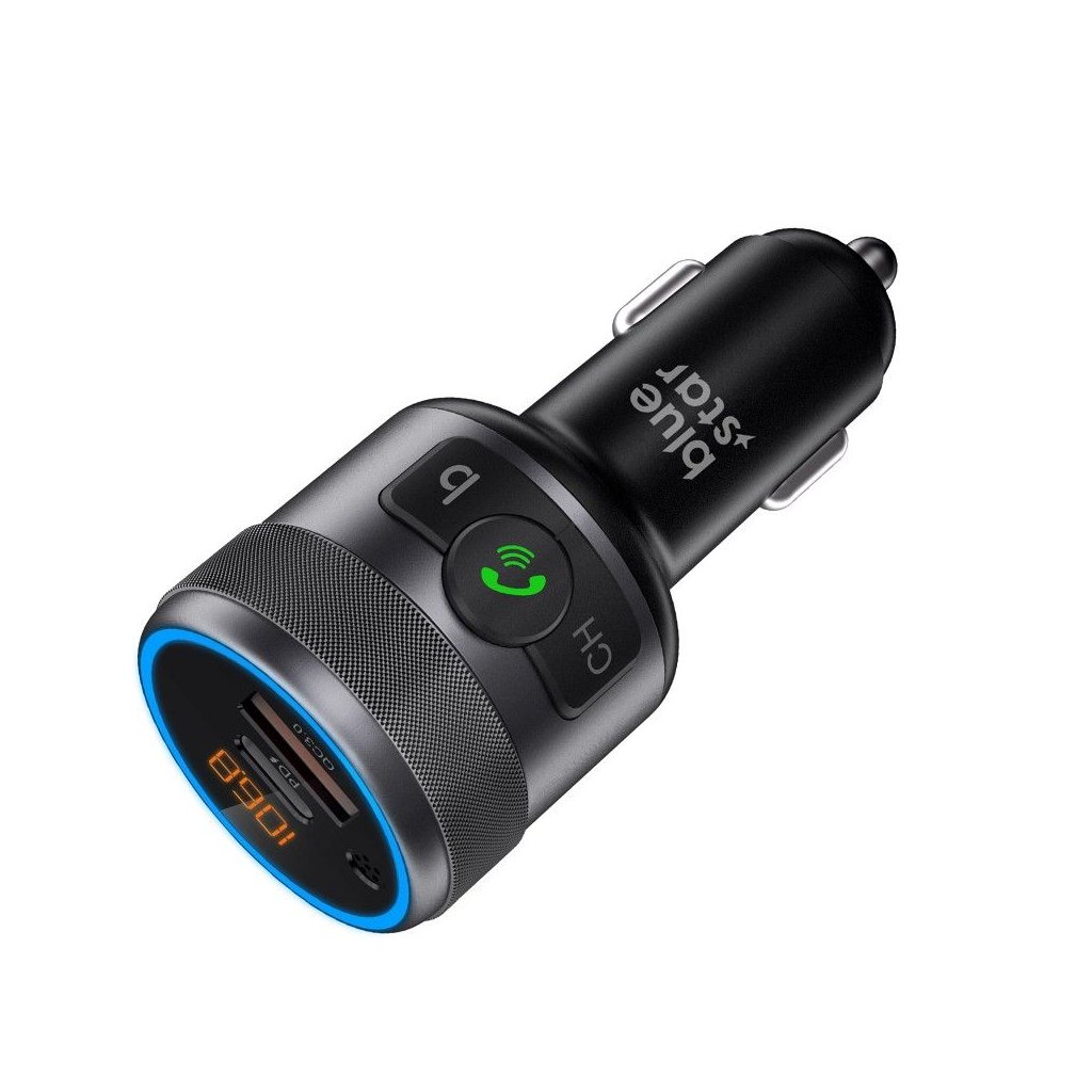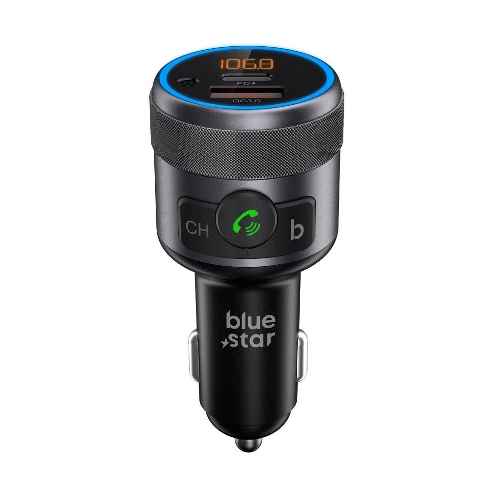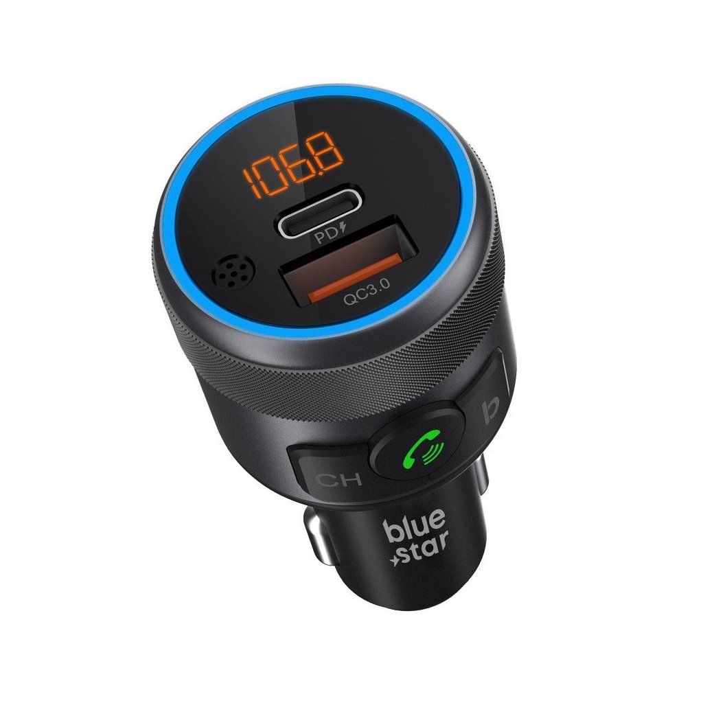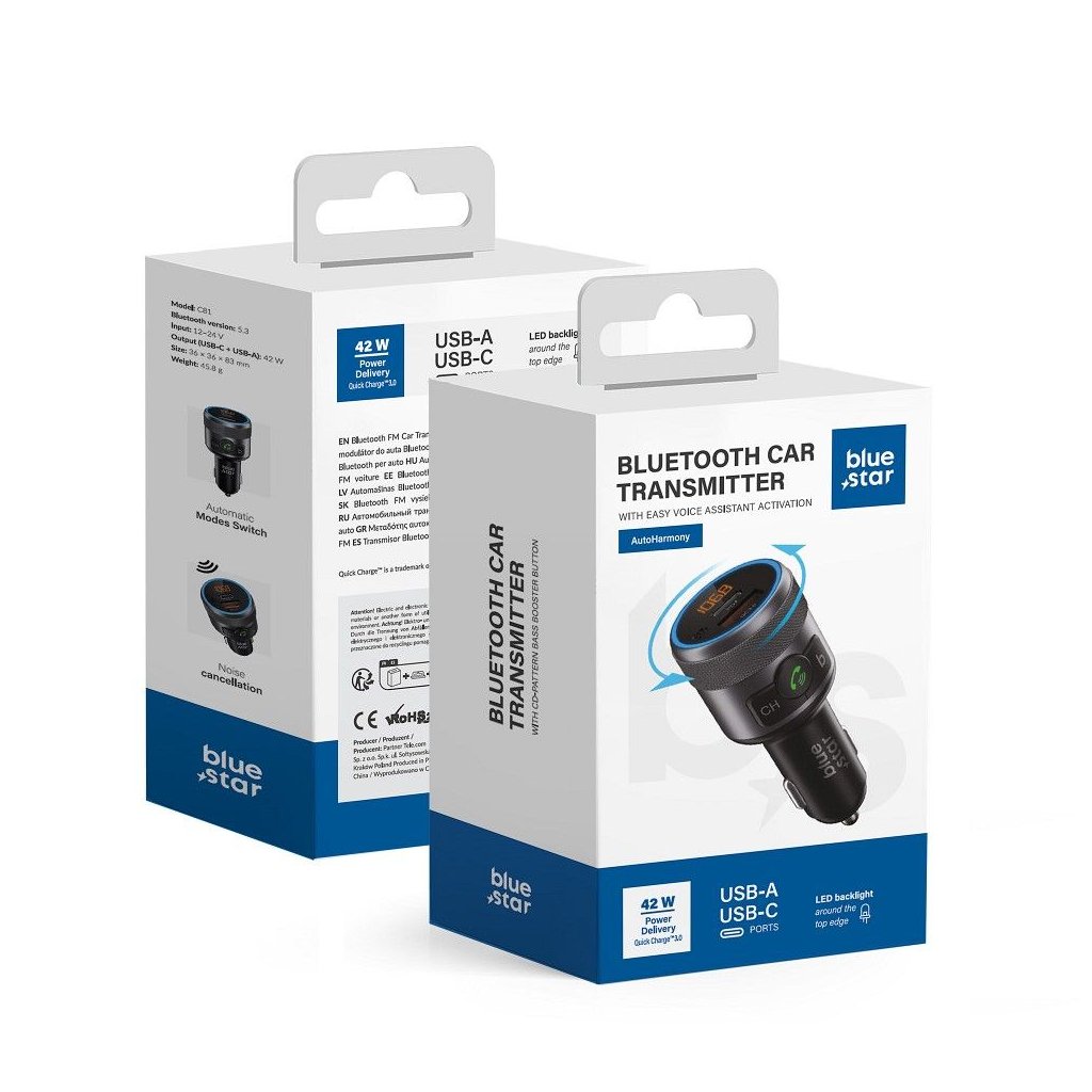 Hliníkový FM vysielač pre BLUE STAR AutoHarmony C81 do auta s 2 portami - USB-C a USB-A - pre rýchle nabíjanie a technológiu Bluetooth. Vďaka FM vysielaču môžete počas jazdy počúvať hudbu zo smartfónu a zabudovaný mikrofón umožňuje hlasné telefonovanie.