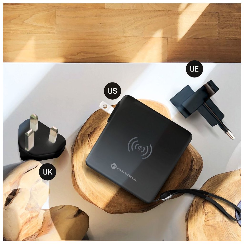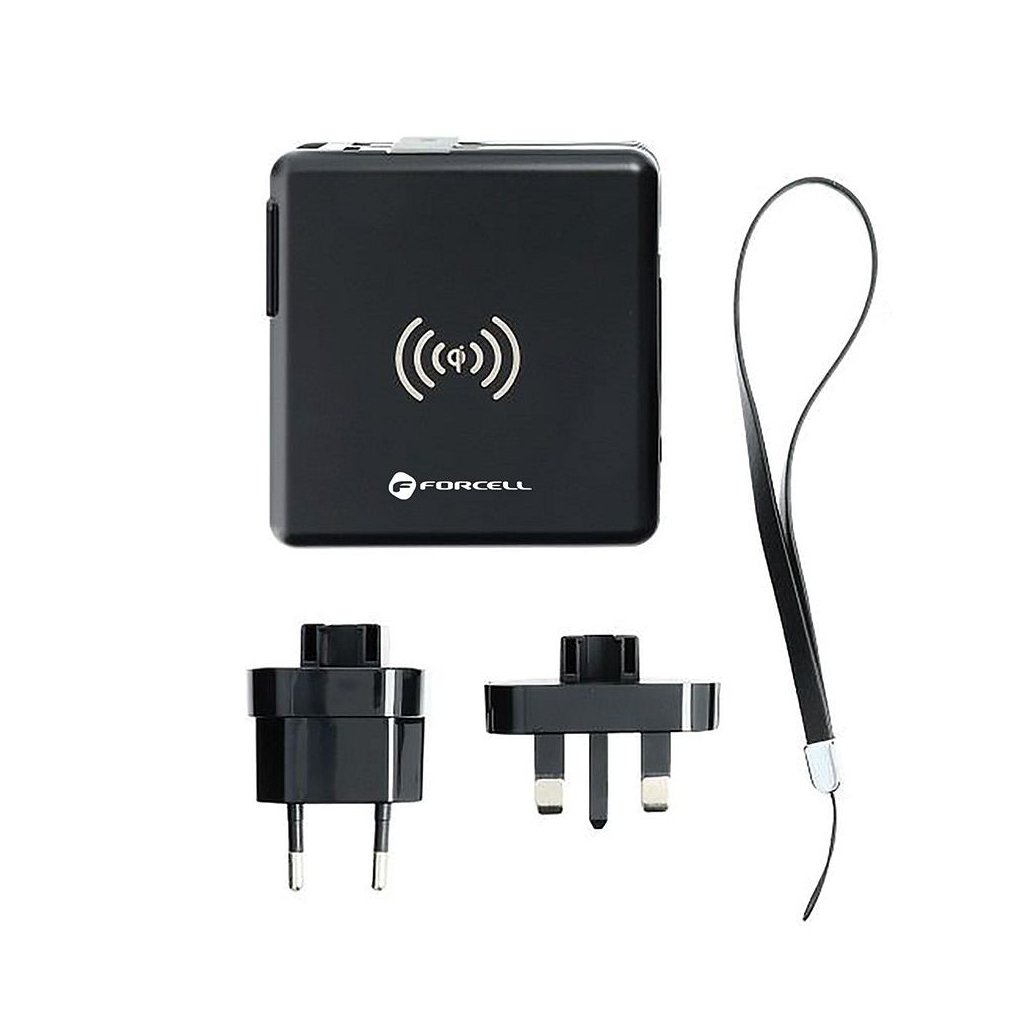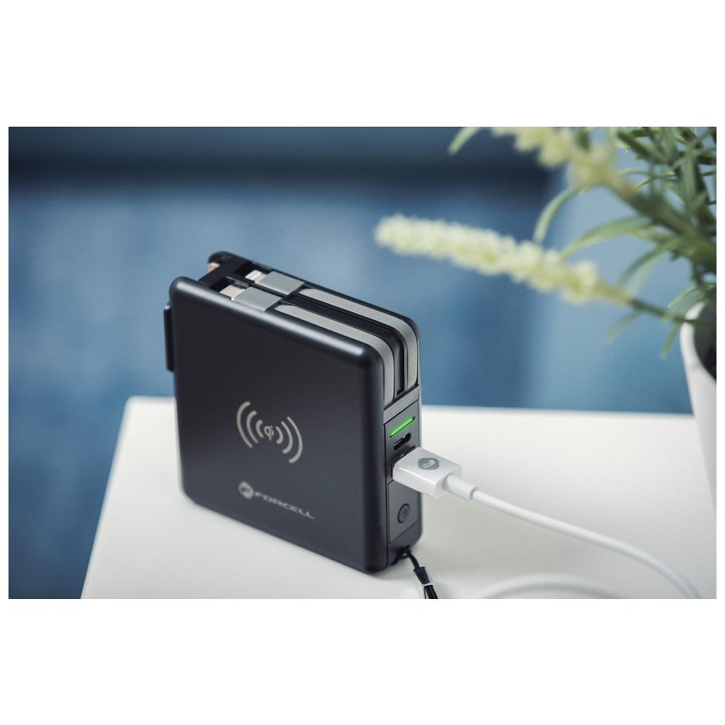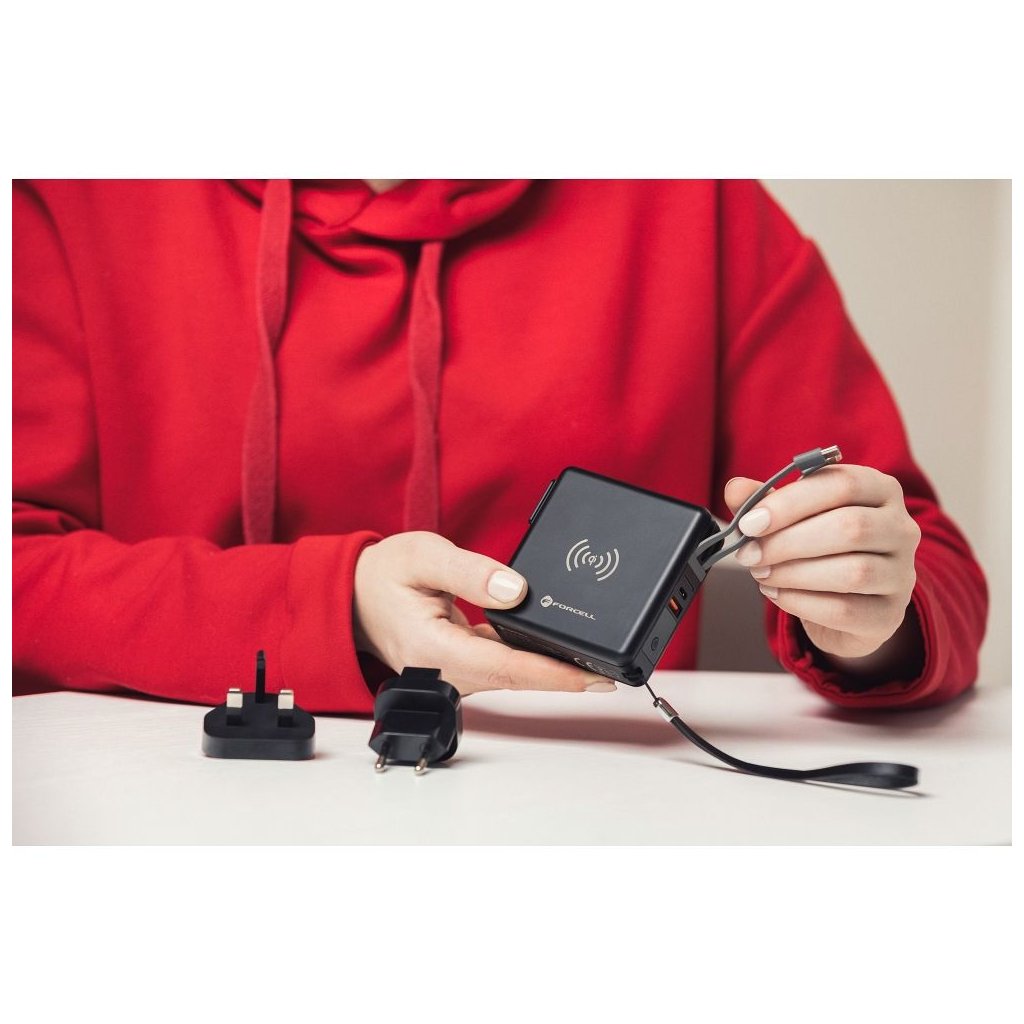 Dokonalá cestovná multi nabíjačka FORCELL 5v1. Vybavený vstavanými konektormi: USB-C, Lightning a power banka. Umožňuje bezdrôtové nabíjanie. Vstavané nabíjacie káble: USB-C, Lightning (kompatibilné s iPhone), umožňujú súčasné nabíjanie niekoľkých rôznych zariadení. Druhý z dvojice káblov je hybridný – ide o kombináciu dvoch konektorov v jednom: Micro USB - Lightning.
