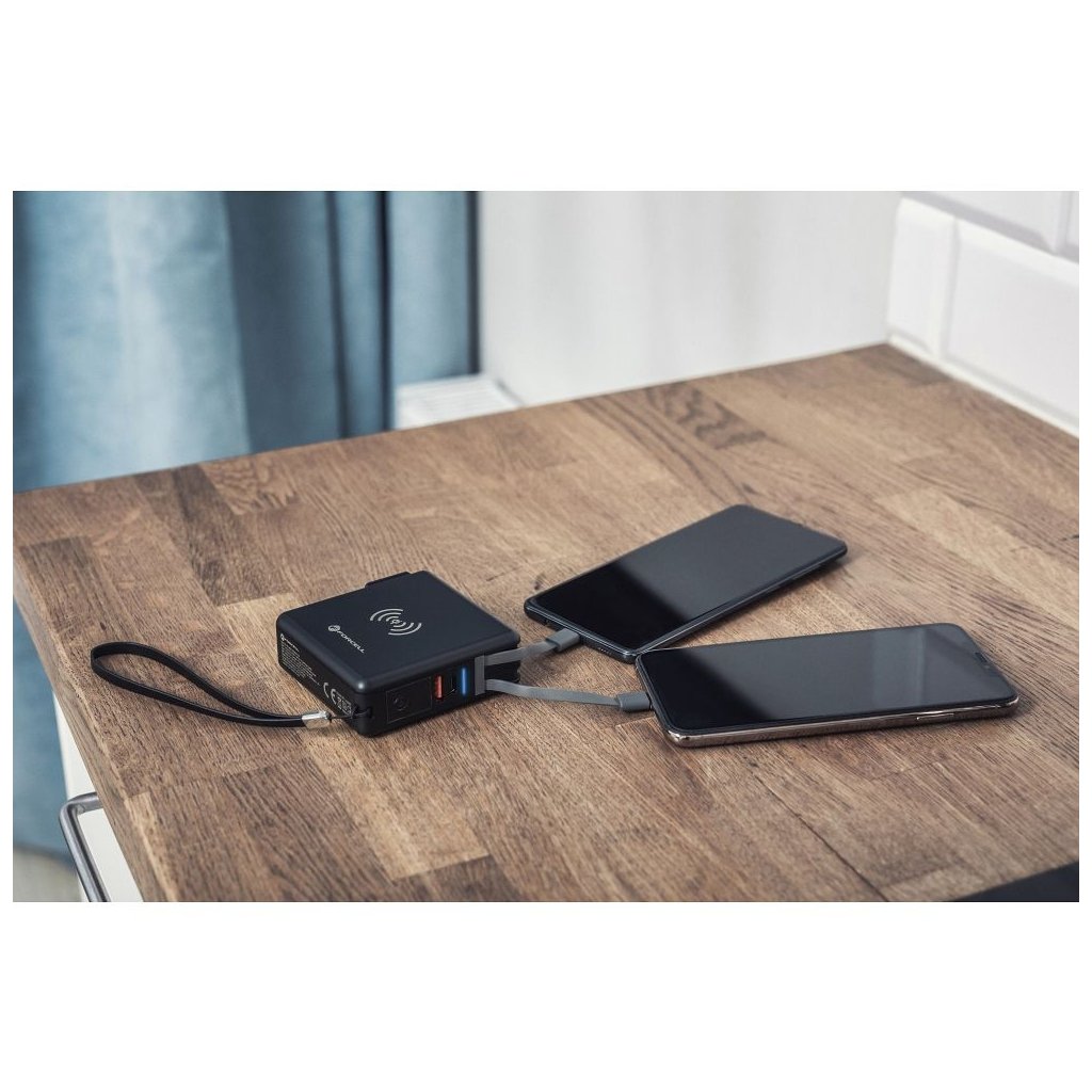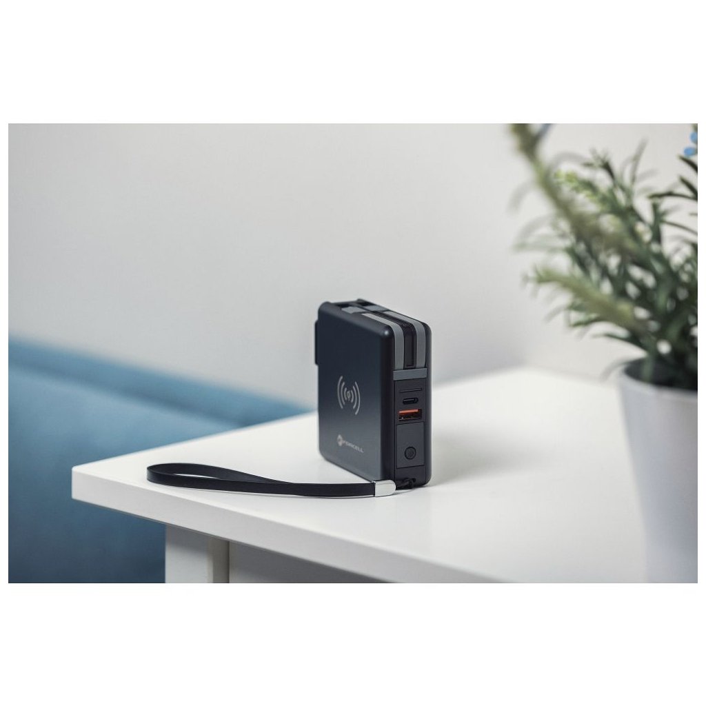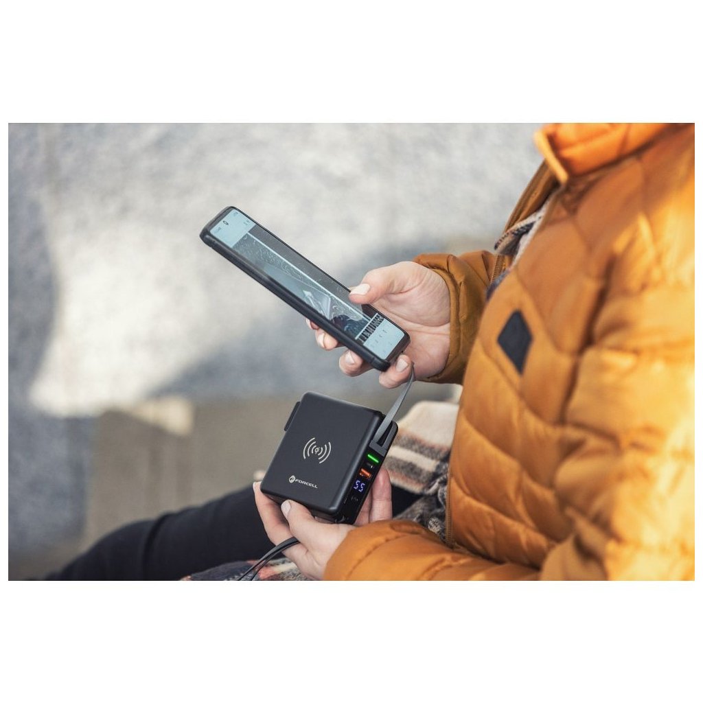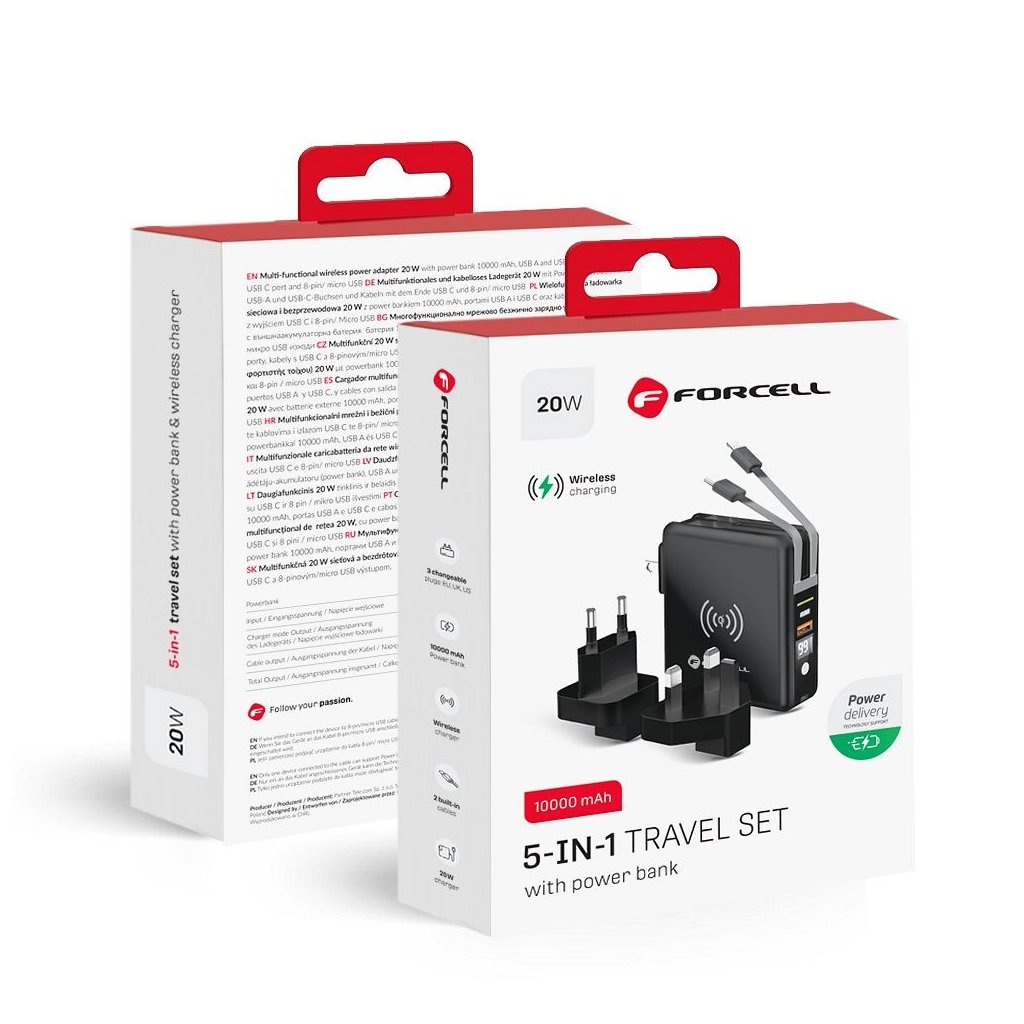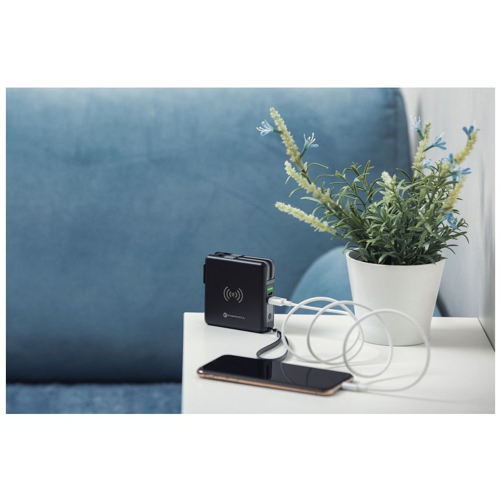 Dokonalá cestovná multi nabíjačka FORCELL 5v1. Vybavený vstavanými konektormi: USB-C, Lightning a power banka. Umožňuje bezdrôtové nabíjanie. Vstavané nabíjacie káble: USB-C, Lightning (kompatibilné s iPhone), umožňujú súčasné nabíjanie niekoľkých rôznych zariadení. Druhý z dvojice káblov je hybridný – ide o kombináciu dvoch konektorov v jednom: Micro USB - Lightning.