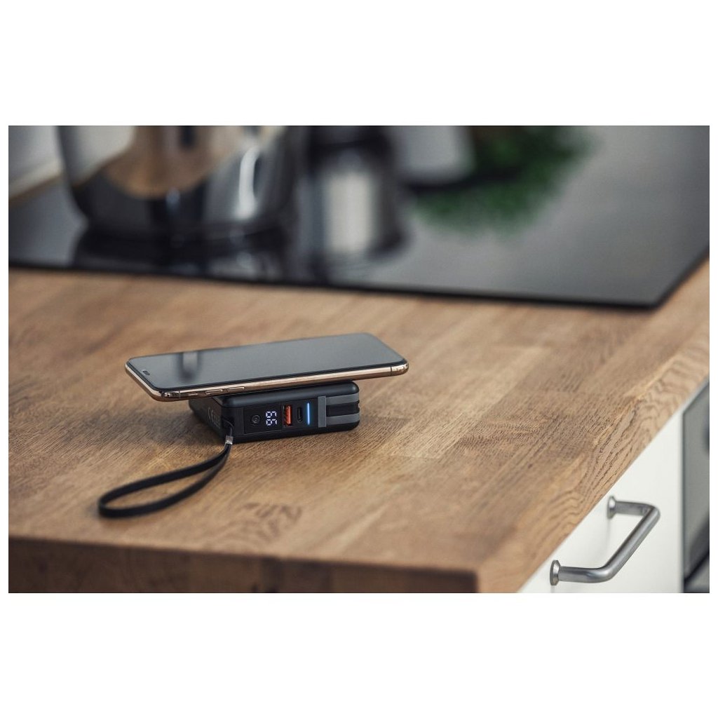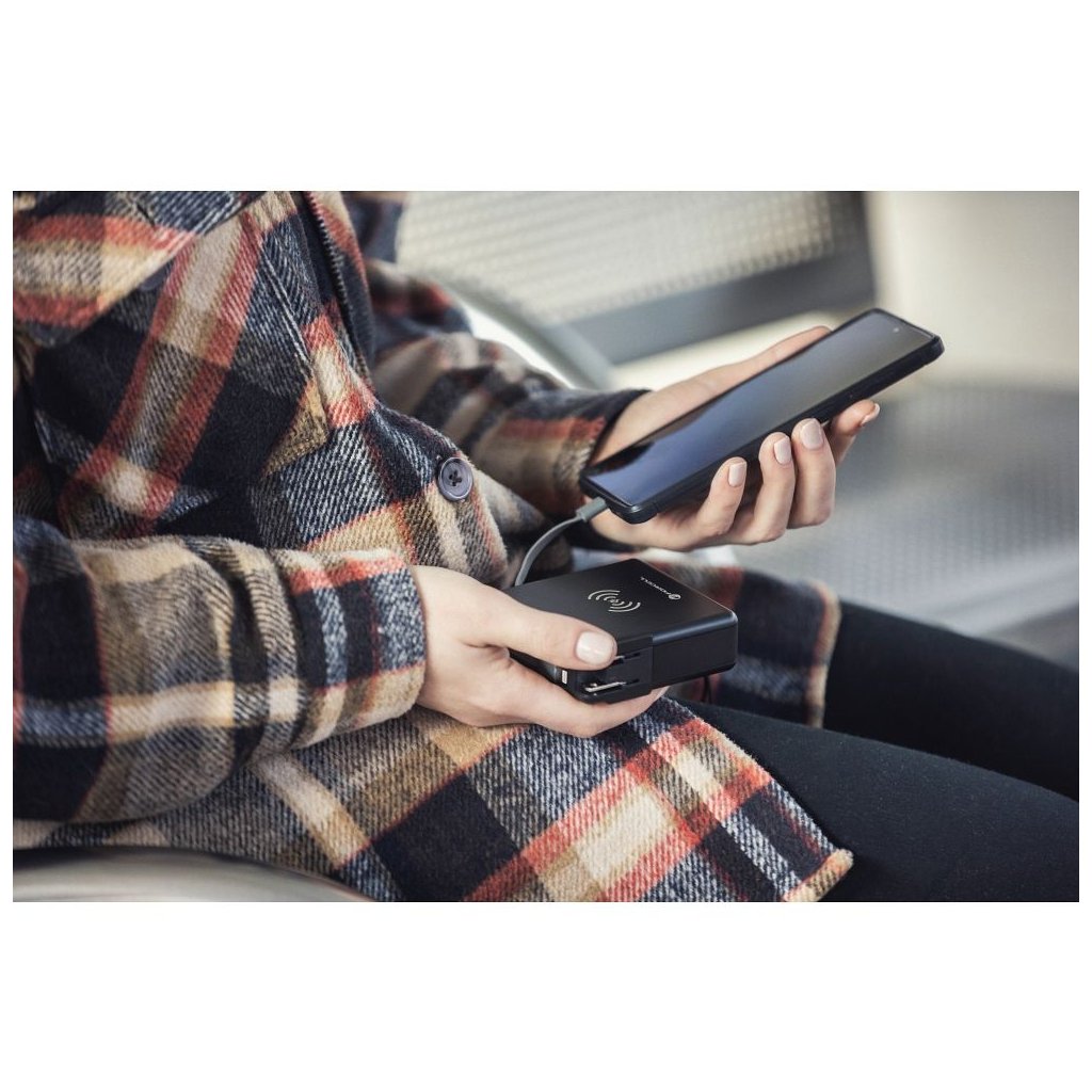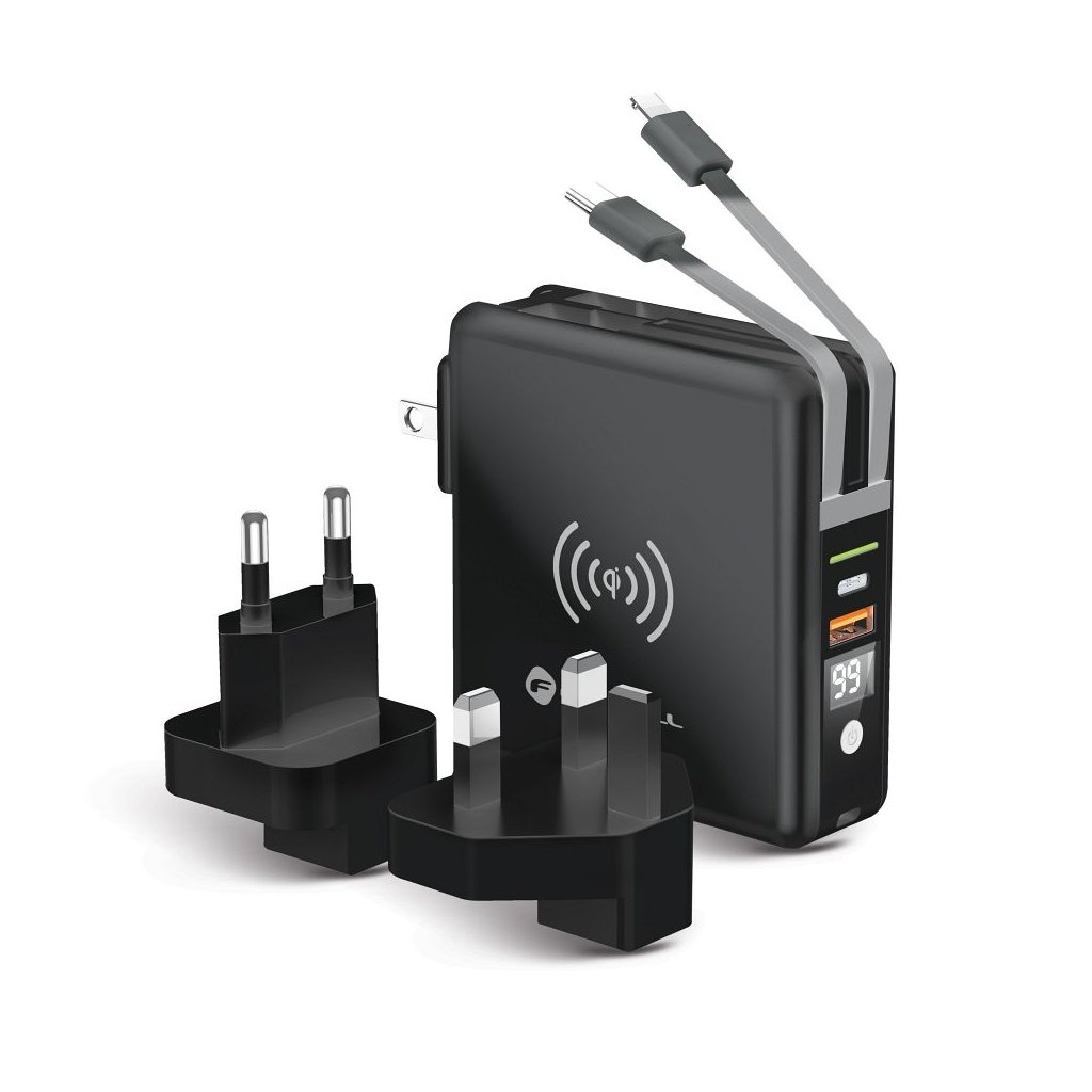 Sada 3 vymeniteľných hrotov UK, US, EU, umožňuje používať rôzne zdroje energie takmer kdekoľvek na svete. Bezdrôtové nabíjanie vám umožní nabíjať zariadenia bez toho, aby ste museli pripájať kábel. Vstavaná power banka (10 000 mAh) s vysokou kapacitou umožňuje viacnásobné napájanie zariadení bez prístupu k zdroju energie.
