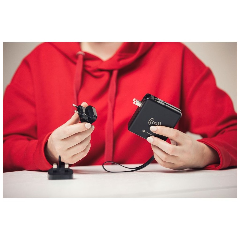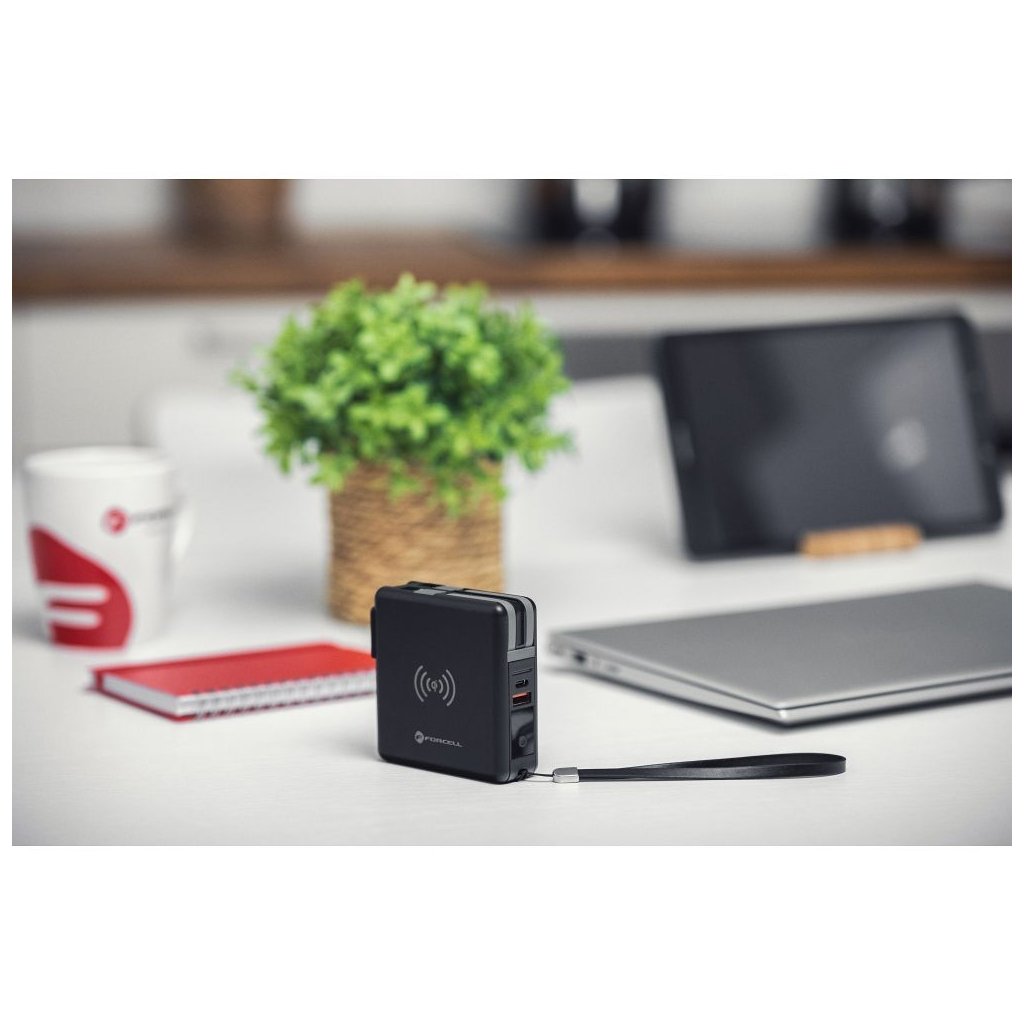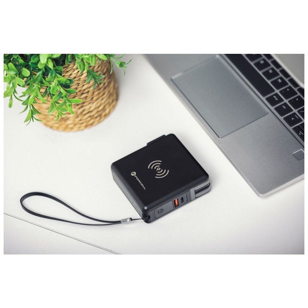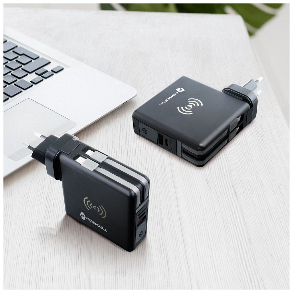 Dokonalá cestovná multi nabíjačka FORCELL 5v1. Vybavený vstavanými konektormi: USB-C, Lightning a power banka. Umožňuje bezdrôtové nabíjanie.