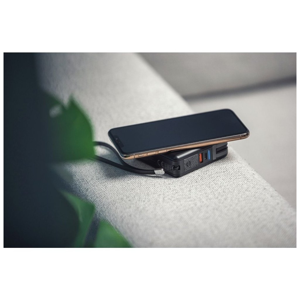 Vstavané nabíjacie káble: USB-C, Lightning (kompatibilné s iPhone), umožňujú súčasné nabíjanie niekoľkých rôznych zariadení. Druhý z dvojice káblov je hybridný – ide o kombináciu dvoch konektorov v jednom: Micro USB - Lightning.
