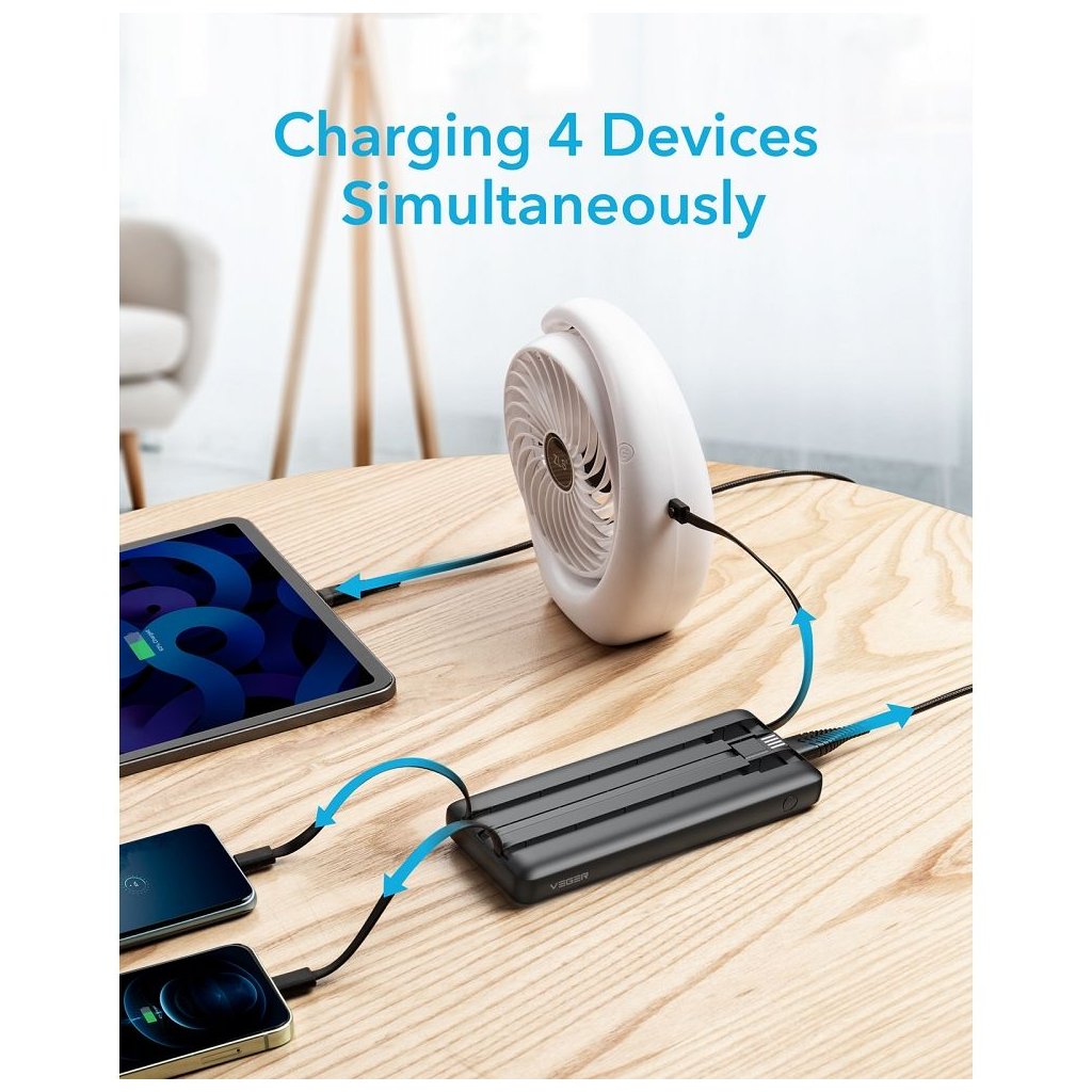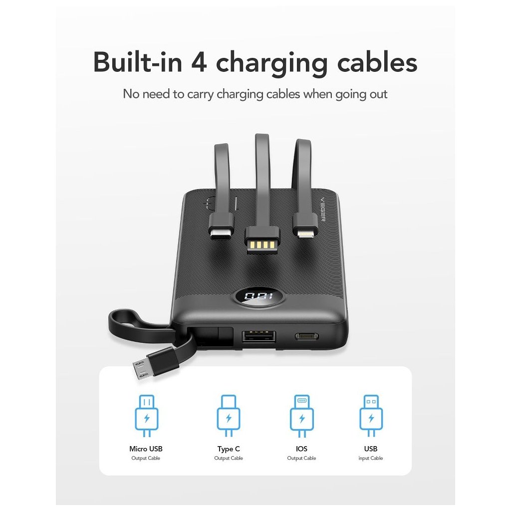 Powerbanka Veger C10 s kapacitou 10 000 mAh s priamo zabudovanými nabíjacími káblami. Už nemusíte hľadať, kde máte káble zo svojej nabíjačky.