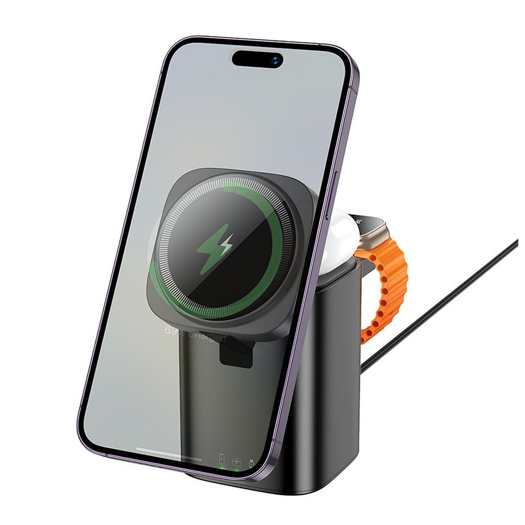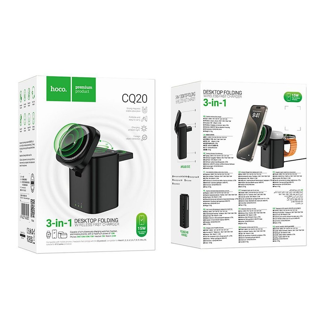 Hoco CQ20 je funkčná bezdrôtová nabíjačka 3 v 1, ktorá umožňuje súčasné nabíjanie smartfónu, Apple Watch a bezdrôtových slúchadiel. Vďaka nabíjaciemu výkonu 15 W a elegantnému čiernemu prevedeniu je ideálna na domáce aj kancelárske použitie.