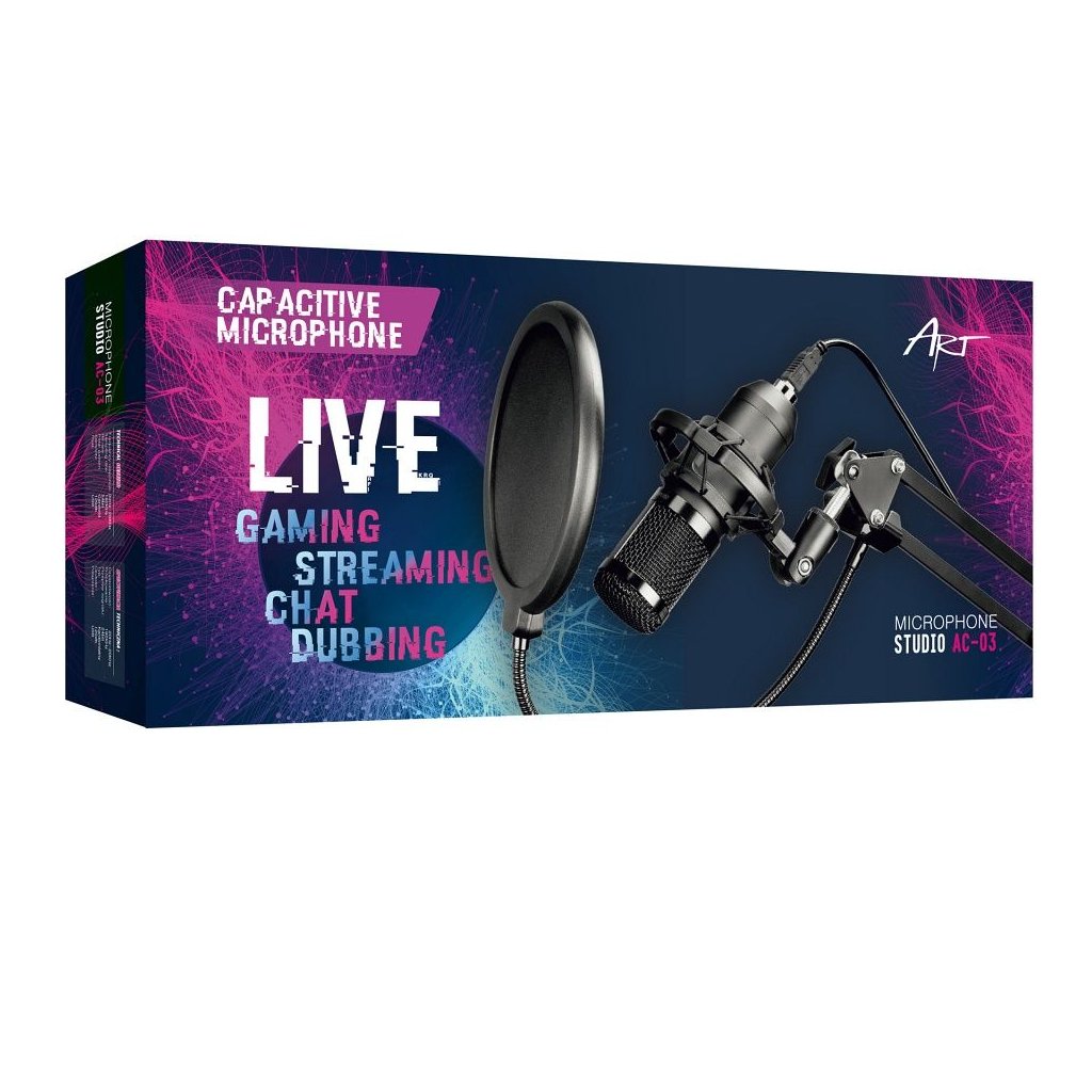 Kondenzátorový mikrofón ART AC-03 na ramene s membránou. Ide o jedinečnú a cenovo dostupnú ponuku určenú najmä pre streamerov, vlogerov, hráčov, ako aj pre ľudí pracujúcich na diaľku.