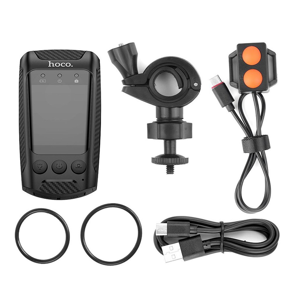 Balenie: Kamera Hoco DV104, držiak na bicykel, kábel USB-A - USB-C, 2 tesniace krúžky