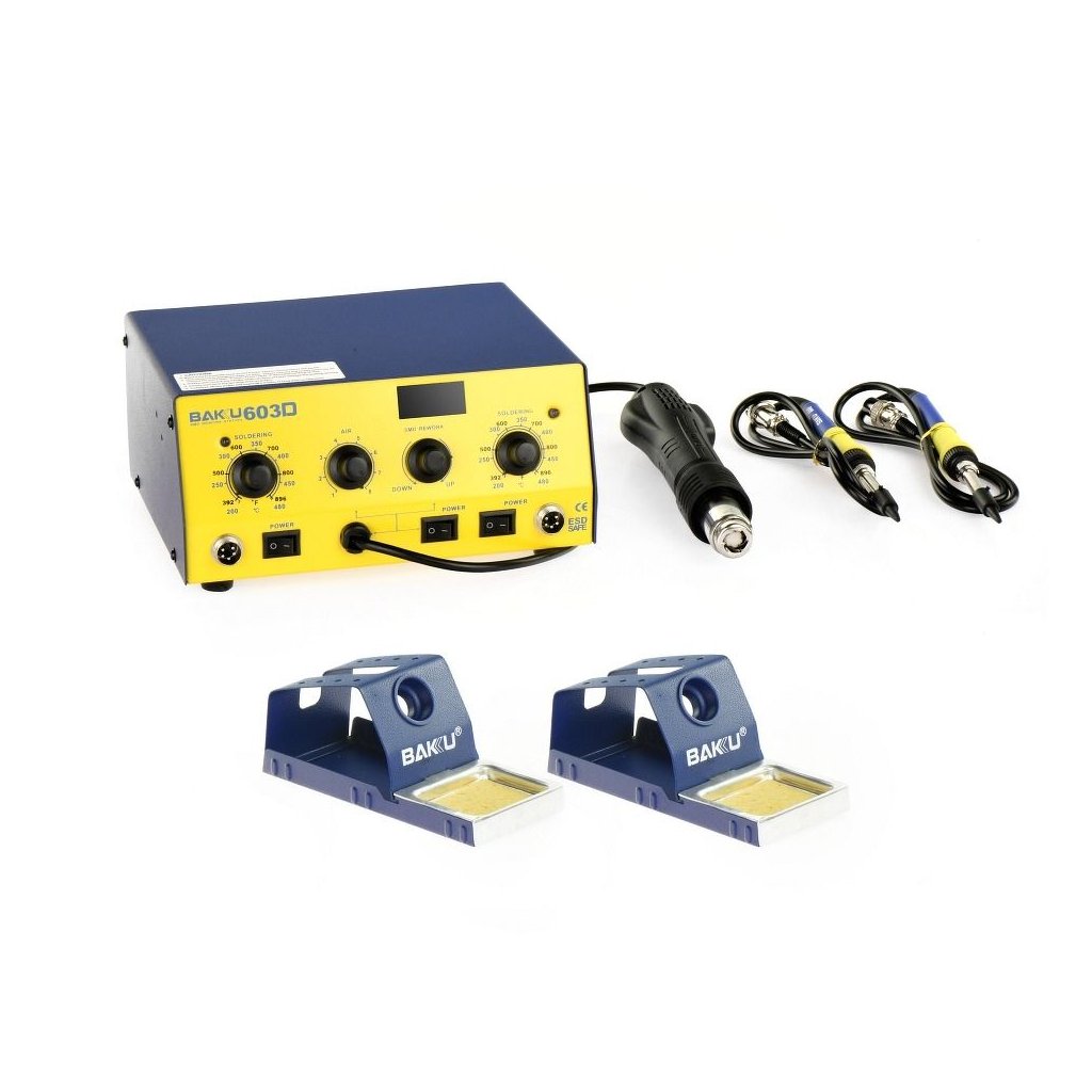 BAKU BK-603D 3v1 spájkovacia stanica s digitálnym displejom. Má dva spájkovacie hroty a teplovzdušnú spájkovačku. Určená na spájkovanie s komponentmi SMD, ako sú systémy 8SOIC, CHIP, PLCC a BGA. Vynikajúca voľba na opravu drobnej elektroniky, ako sú mobilné telefóny a videokamery, ako aj domáce spotrebiče.