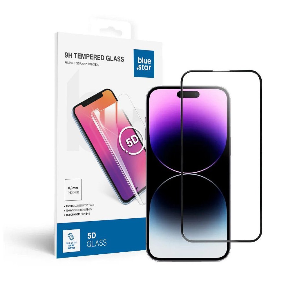 Tvrdené sklo 5D to iPhone 14 PRO MAX (full glue) Blue Star 5D - okraj čierny zaistí Vášmu smartfónu efektívnu ochranu, vynikajúcu čistotu obrazu a zamaskuje škrabance na displeji. Ochranné tvrdené sklo Bluestar 5D poskytuje ochranu celému displeju telefónu vrátane jeho bokov. Vďaka oleofóbnemu poťahu sa nemusíte báť odtlačkov prstov a zachytávania mastnôt.