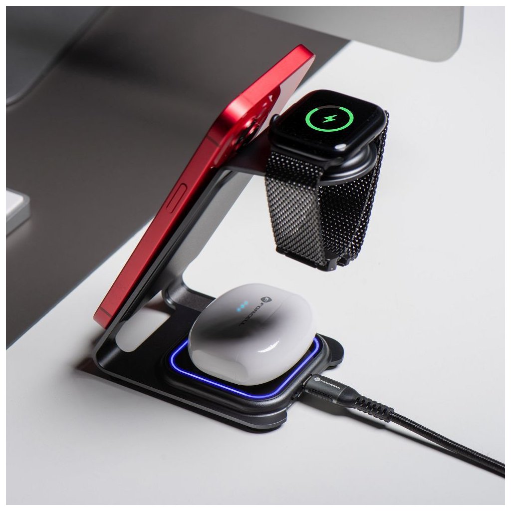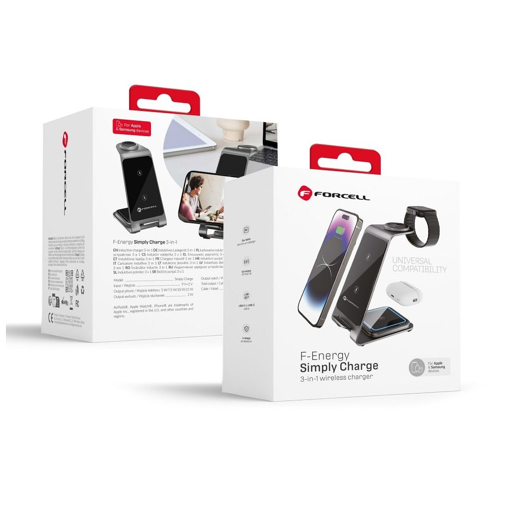 Forcell F-Energy Simply Charge je kompaktné a funkčné riešenie, ktoré vám umožňuje nabíjať tri zariadenia naraz – smartfón, TWS slúchadlá a inteligentné hodinky – s celkovým výkonom až 15 W. Podporuje rýchle nabíjanie, ponúka univerzálnu kompatibilitu so zariadeniami Apple a Samsung a vyznačuje sa odolným hliníkovým dizajnom, ktorý zaisťuje spoľahlivosť a elegantný vzhľad v akomkoľvek prostredí.