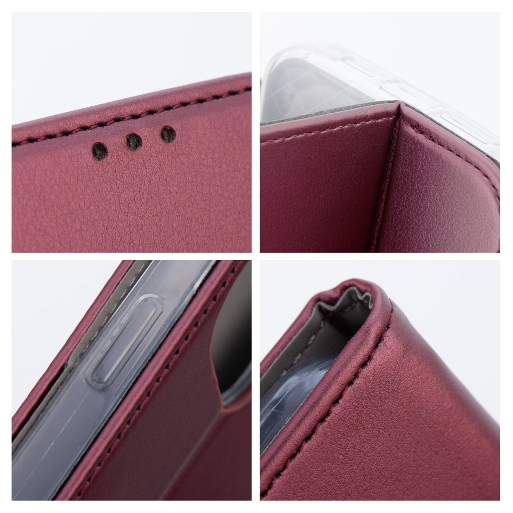 Peňaženkový obal SMART MAGNETO Book pre HONOR 400 bordový s magnetickým zapínaním je klasické puzdro na telefón s funkciou peňaženky a stojana na TV. Je vyrobené z metalizovaného materiálu, podšité mäkkou tkaninou, ktorá chráni obrazovku pred poškriabaním.