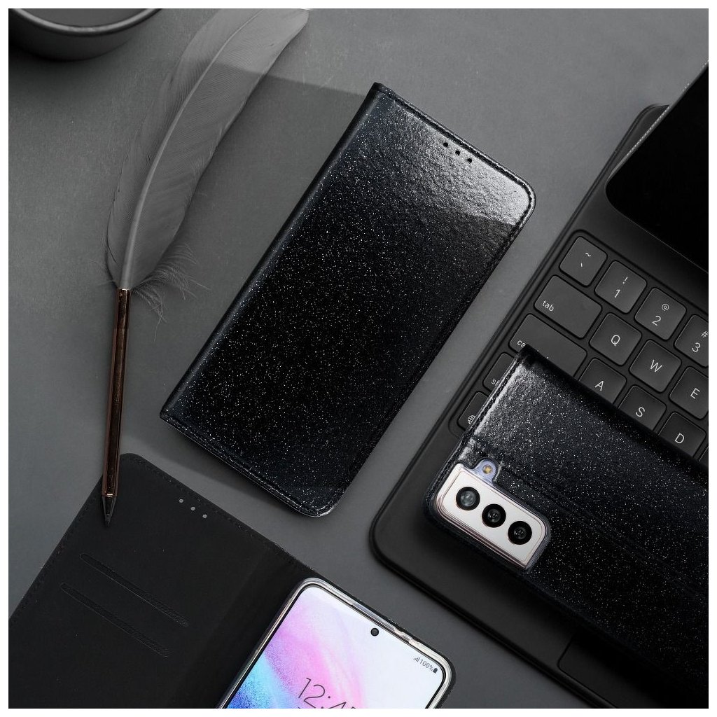 Pouzdro Forcell Shining Book pro Apple Iphone 11 PRO MAX je vyrobeno z vysoce kvalitní a odolné měkké technické kůže, která je na okrajích prošívaná. Pouzdro má jemné třpytky, které na denním světle vytváří zajímavé odlesky.
