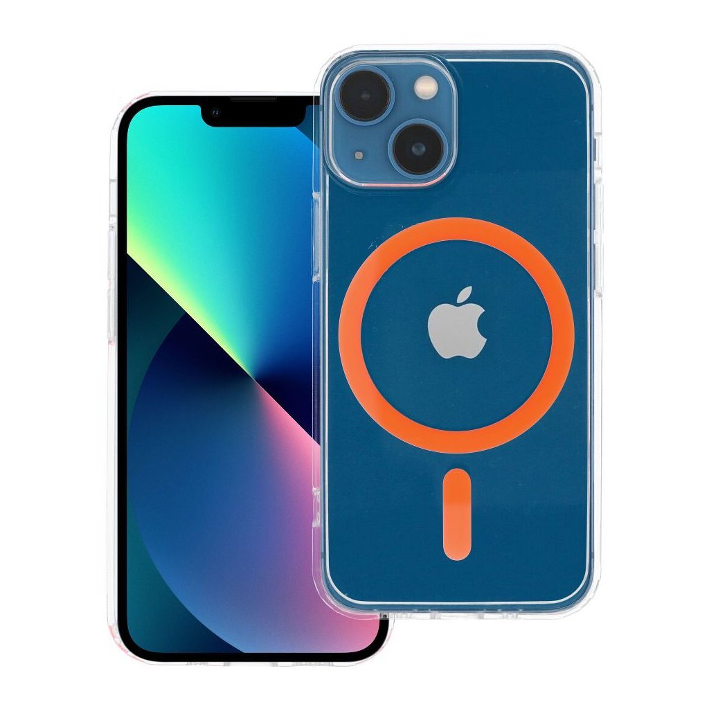 Priehľadný obal s for IPHONE 13 MINI oranžový, ktorého odolná a priehľadná vrstva chráni Váš telefón pred nárazmi alebo poškriabaním. Produkt je kompatibilný s technológiou MagSafe, ktorá umožňuje indukčné nabíjanie.