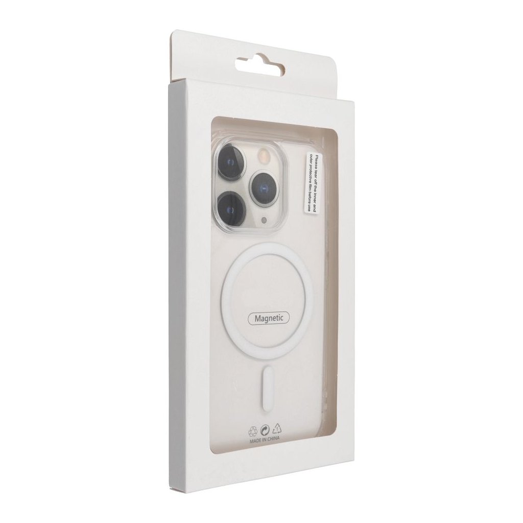 Priehľadný obal s for IPHONE 13 PRO MAX biely, ktorého odolná a priehľadná vrstva chráni Váš telefón pred nárazmi alebo poškriabaním. Produkt je kompatibilný s technológiou MagSafe, ktorá umožňuje indukčné nabíjanie.
