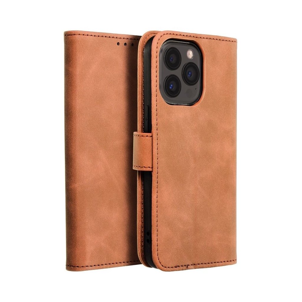 Zatvárací peňaženkový obal TENDER Book pre IPHONE 13 Pro hnedý v príjemnej imitácii kože v decentných farbách je ako stvorené pre každého, kto má skutočne štýl. Materiál je na dotyk veľmi príjemný a mäkký, telefónu ale poskytuje plnú ochranu zo všetkých strán.