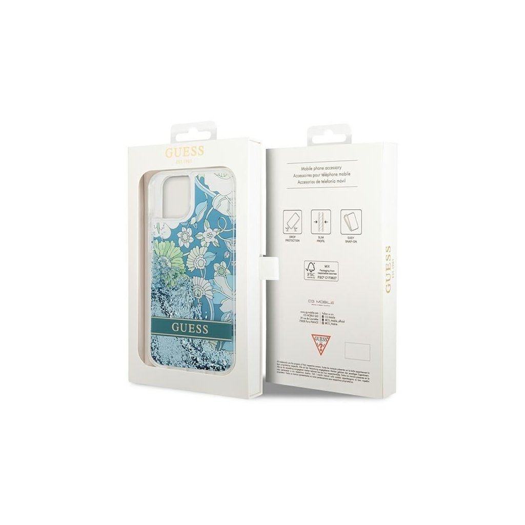 Štýlové a Originálne puzdro GUESS pre IPHONE 13 / 14 / 15 GUHCP14SLFLSN (Flower Liquid Glitter) zelené je kvalitný obal na Váš telefón vyrobený z odolných materiálov, s prepracovanými detailmi a dizajnom.