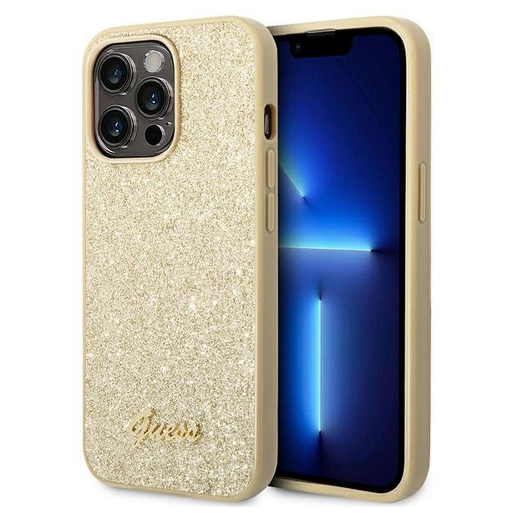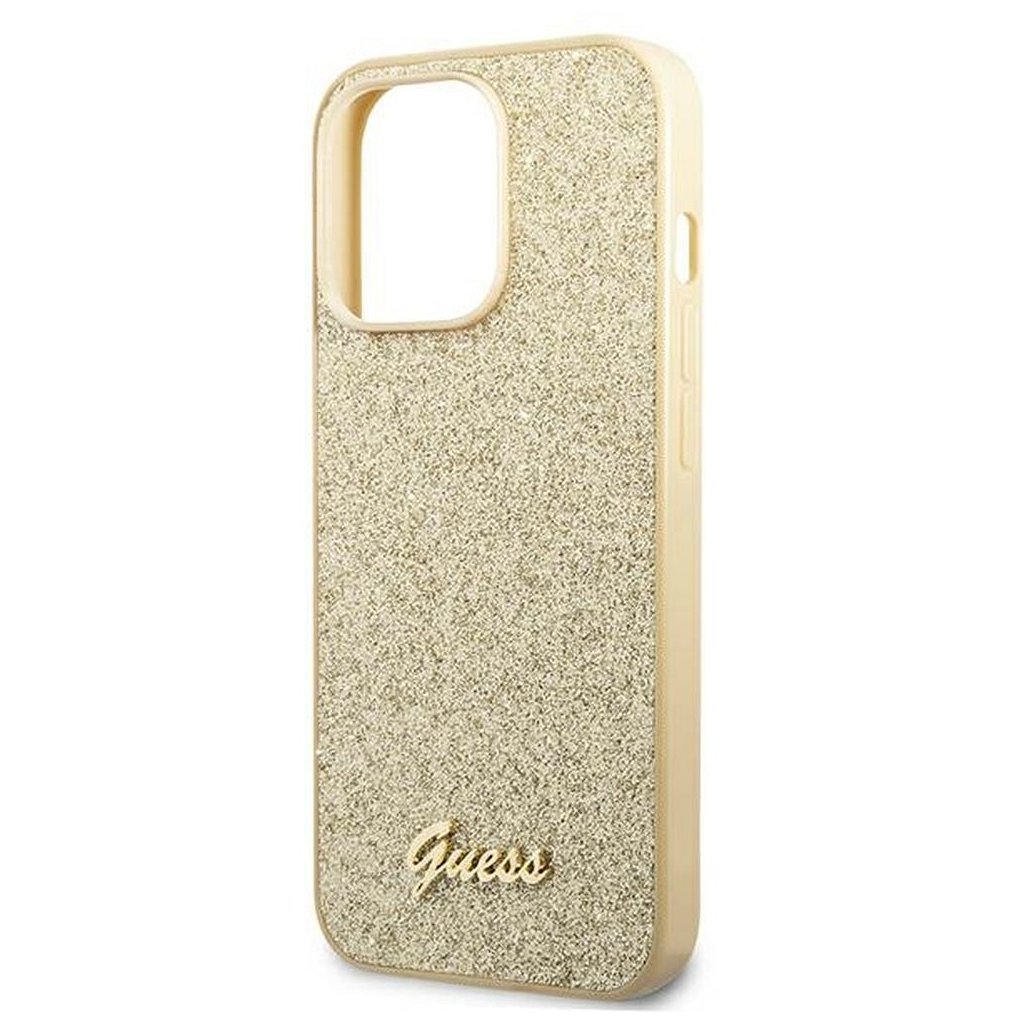 Štýlové a GUESS pre IPHONE 14 Pro Max GUHCP14XHGGSHD (Glitter Flakes Script Metal Logo) zlaté je kvalitný obal na Váš telefón vyrobený z odolných materiálov, s prepracovanými detailmi a dizajnom.