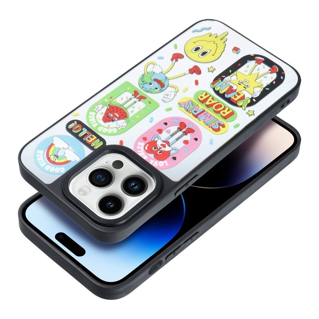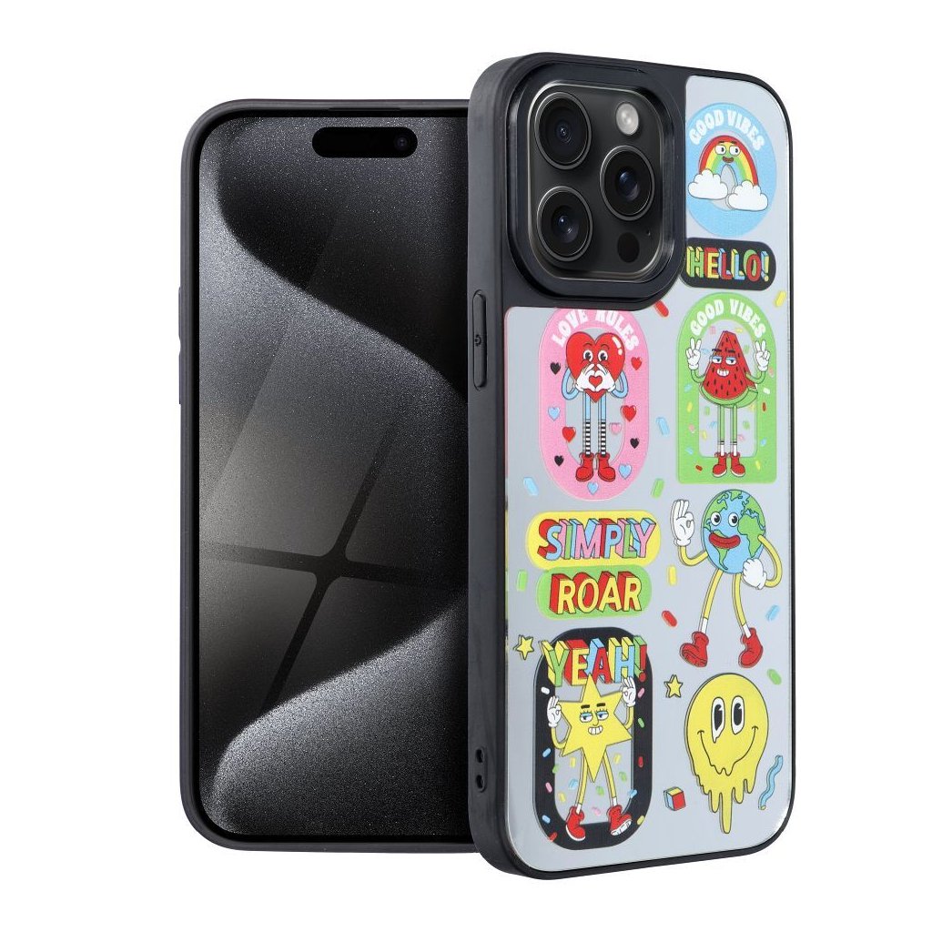 Štýlový a pestrofarebný obal ROAR case CHILL FLASH for IPHONE 14 Pro Max vzor 1 sa vyznačuje jedinečným dizajnom so zrkadlovým povrchom, farebnými nálepkami, pružnými gumenými stranami a vyvýšeným okrajom okolo ostrovčeka fotoaparátu.