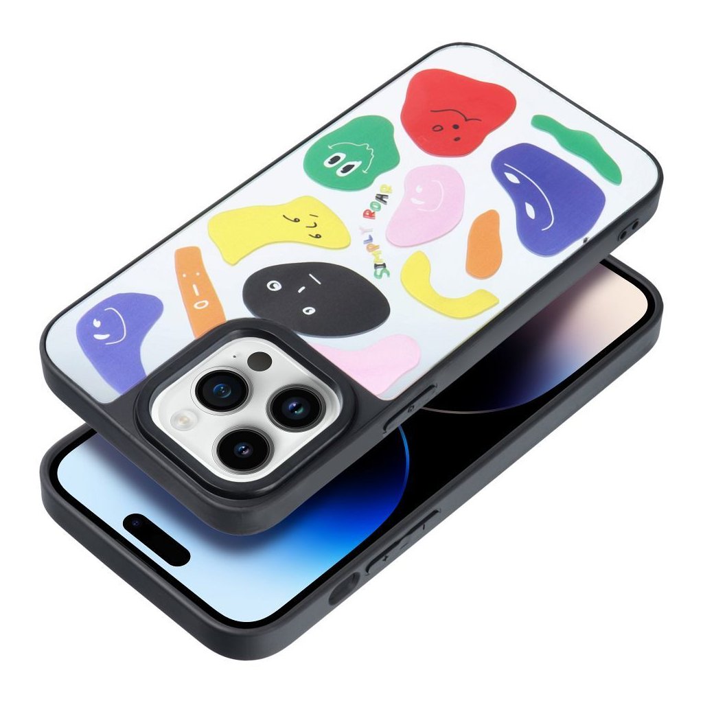 Štýlový a pestrofarebný obal ROAR case CHILL FLASH for IPHONE 14 Pro Max vzor 2 sa vyznačuje jedinečným dizajnom so zrkadlovým povrchom, farebnými nálepkami, pružnými gumenými stranami a vyvýšeným okrajom okolo ostrovčeka fotoaparátu.
