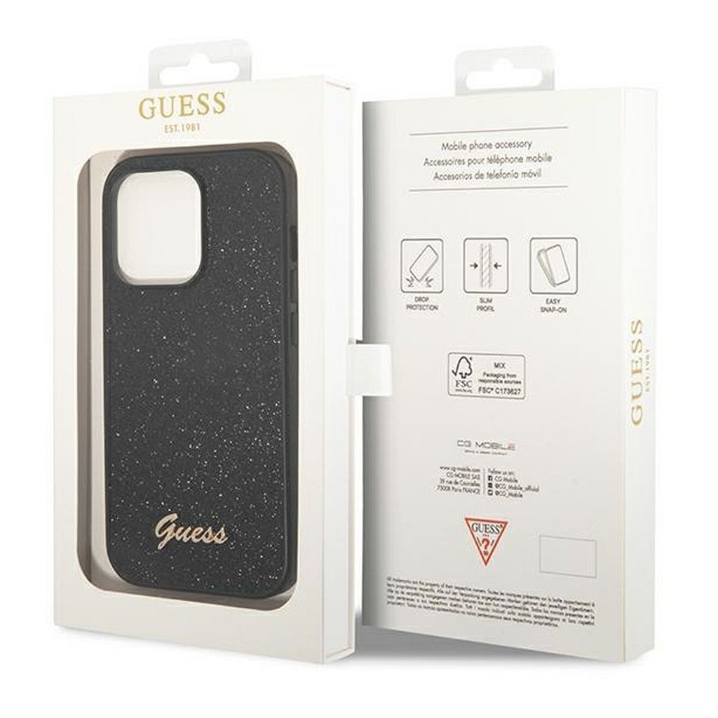 Štýlové a GUESS pre IPHONE 14 Pro GUHCP14LHGGSHK (Glitter Flakes Script Metal Logo) čierne je kvalitný obal na Váš telefón vyrobený z odolných materiálov, s prepracovanými detailmi a dizajnom.