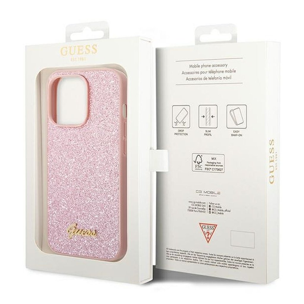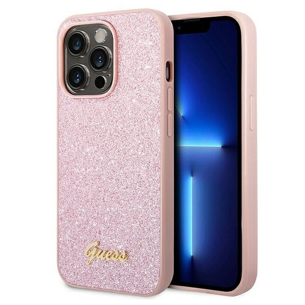Štýlové a GUESS pre IPHONE 14 Pro GUHCP14LHGGSHP (Glitter Flakes Script Metal Logo) ružové je kvalitný obal na Váš telefón vyrobený z odolných materiálov, s prepracovanými detailmi a dizajnom.