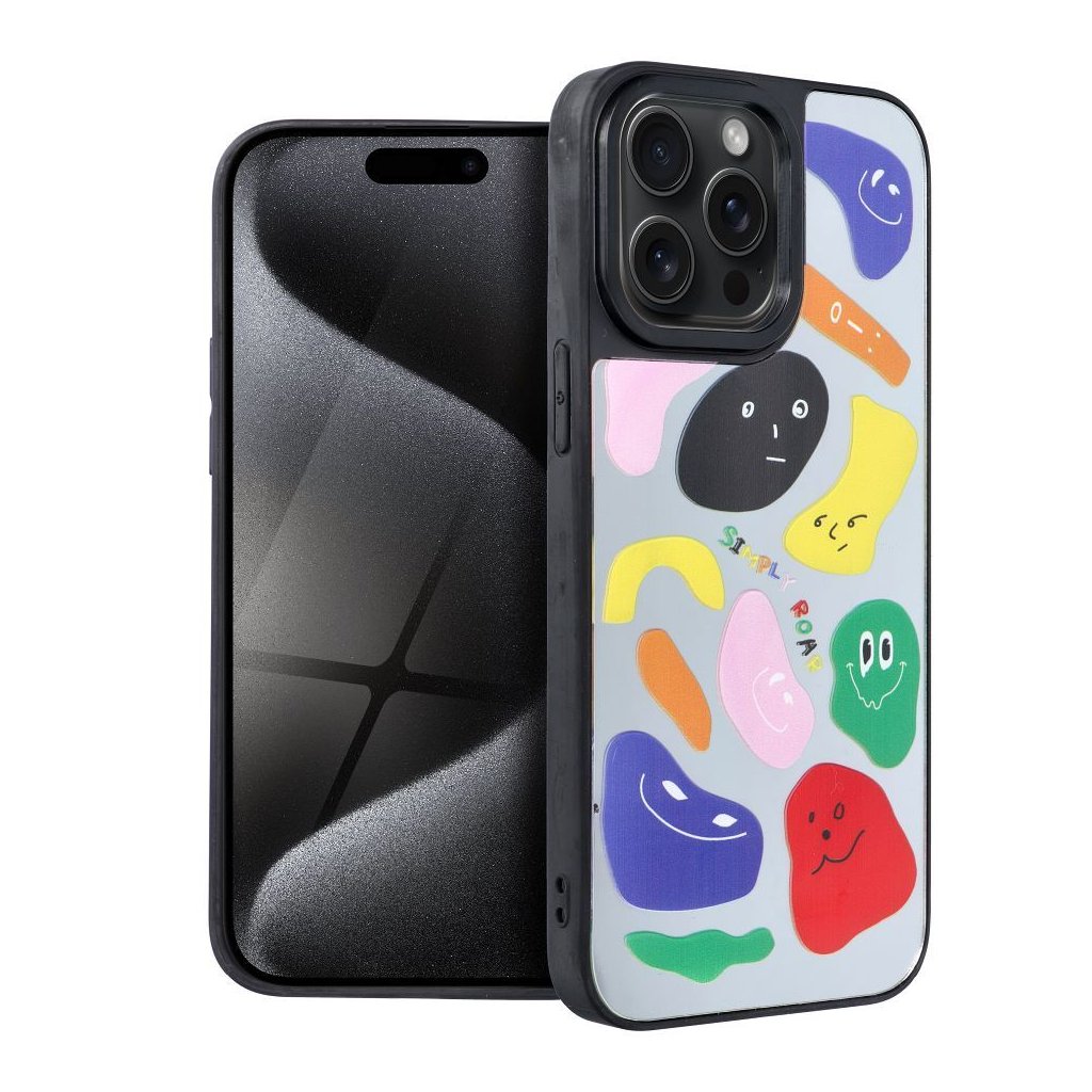 Štýlový a pestrofarebný obal ROAR case CHILL FLASH for IPHONE 14 Pro vzor 2 sa vyznačuje jedinečným dizajnom so zrkadlovým povrchom, farebnými nálepkami, pružnými gumenými stranami a vyvýšeným okrajom okolo ostrovčeka fotoaparátu.