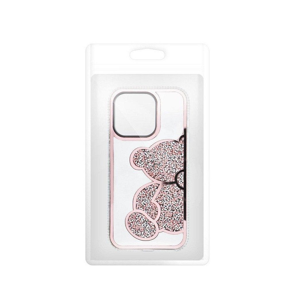 Elegantný kryt na mobil TEDDY BEAR pre IPHONE 14 Pro ružový ktorý sa vyznačuje charakteristickým trblietavým vzorom medvedíka, vyvýšenými okrajmi a plastom.