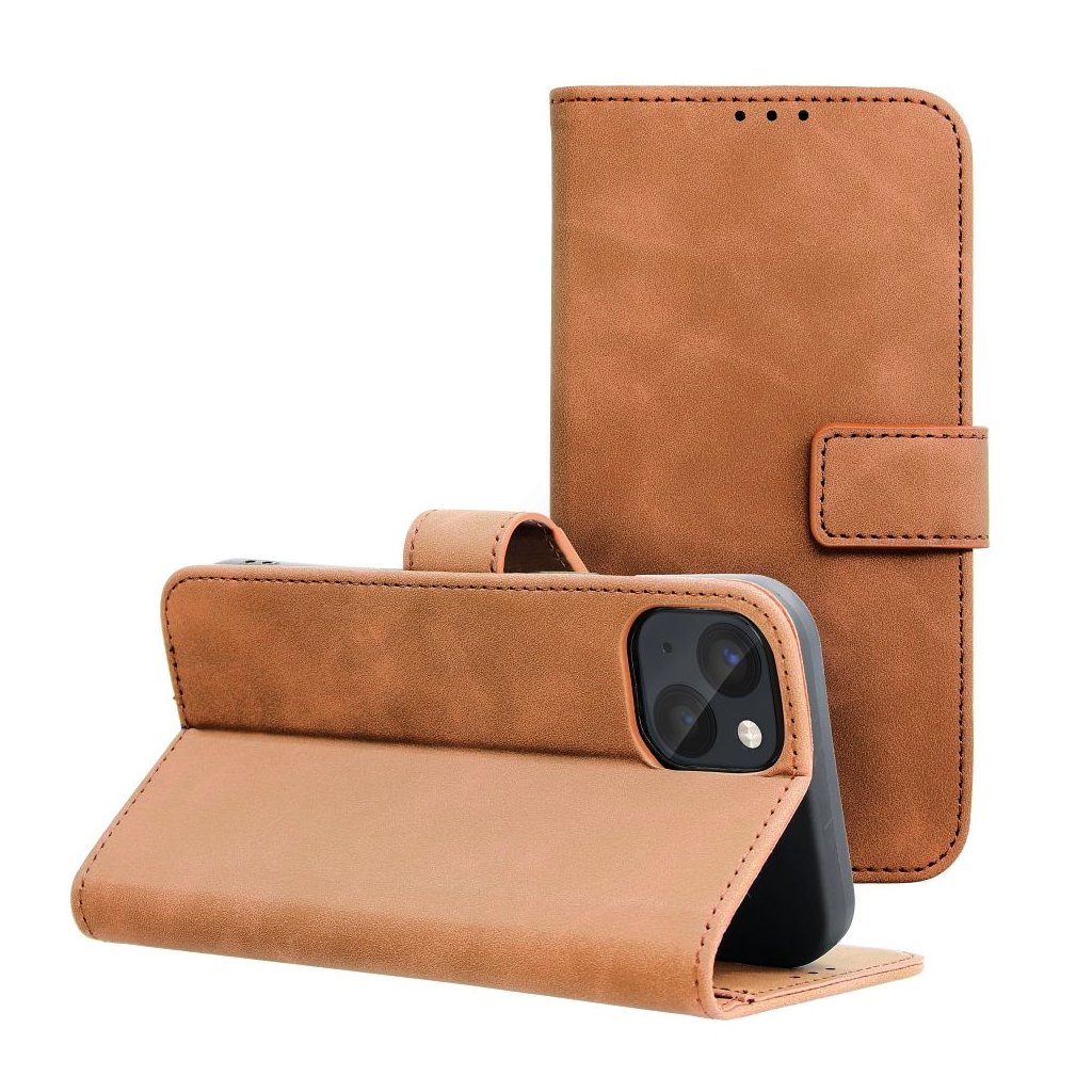 Zatvárací peňaženkový obal TENDER Book pre IPHONE 14 hnedý v príjemnej imitácii kože v decentných farbách je ako stvorené pre každého, kto má skutočne štýl. Materiál je na dotyk veľmi príjemný a mäkký, telefónu ale poskytuje plnú ochranu zo všetkých strán.