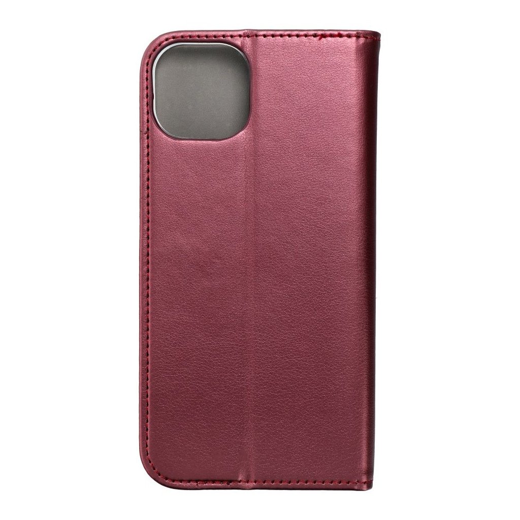 Peňaženkový obal SMART MAGNETO Book pre IPHONE 15 Plus bordový s magnetickým zapínaním je klasické puzdro na telefón s funkciou peňaženky a stojana na TV. Je vyrobené z metalizovaného materiálu, podšité mäkkou tkaninou, ktorá chráni obrazovku pred poškriabaním.